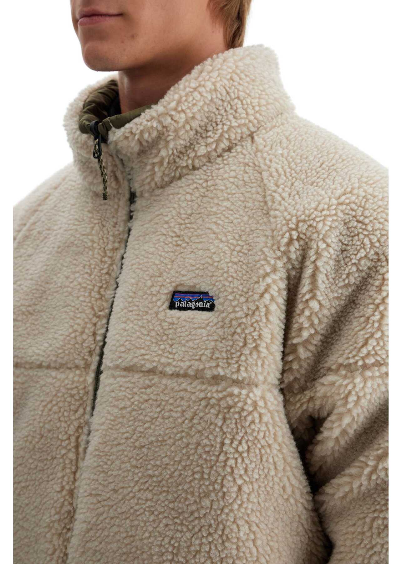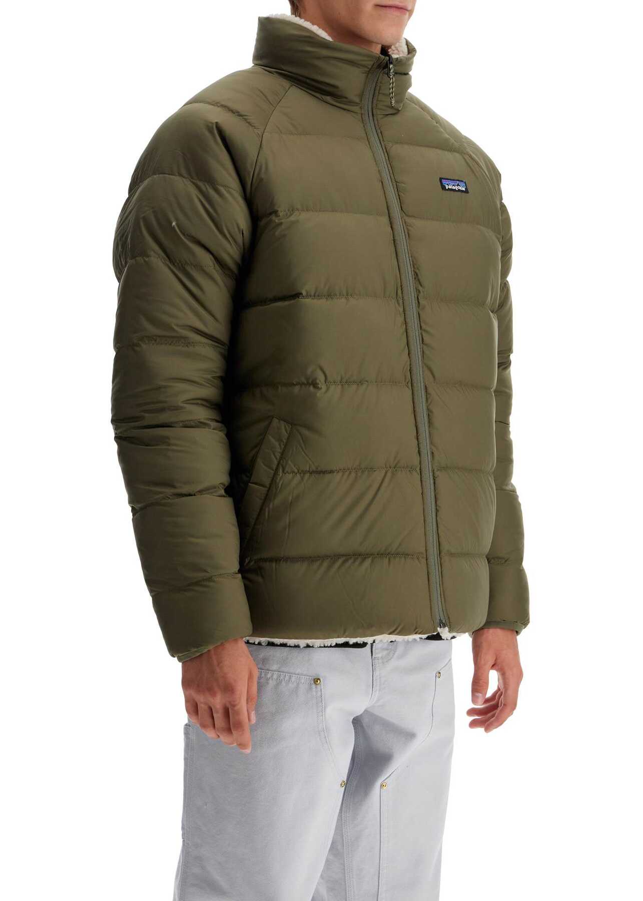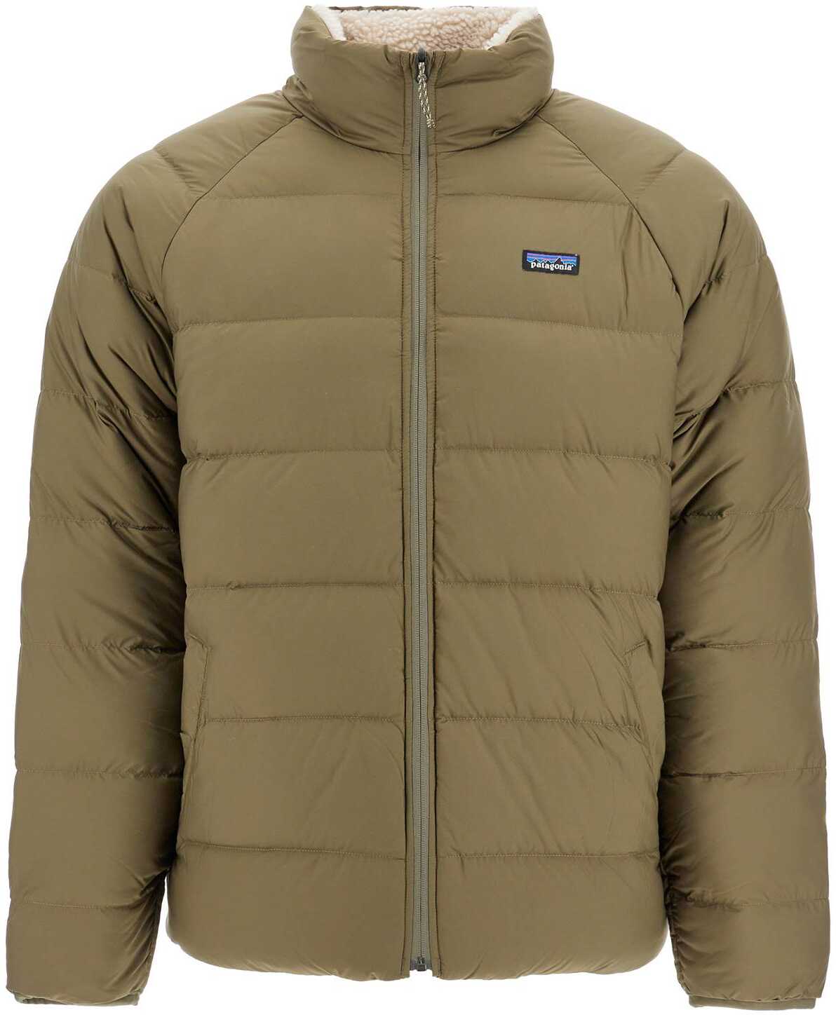 The Patagonia Reversible Down Jacket features a quilted exterior made of recycled polyester and 100% recycled 700-fill-power down insulation, with a cozy fleece interior. It has a full zip closure, side pockets, raglan sleeves, and a regular fit. The model is 187 cm tall and wears a size L.