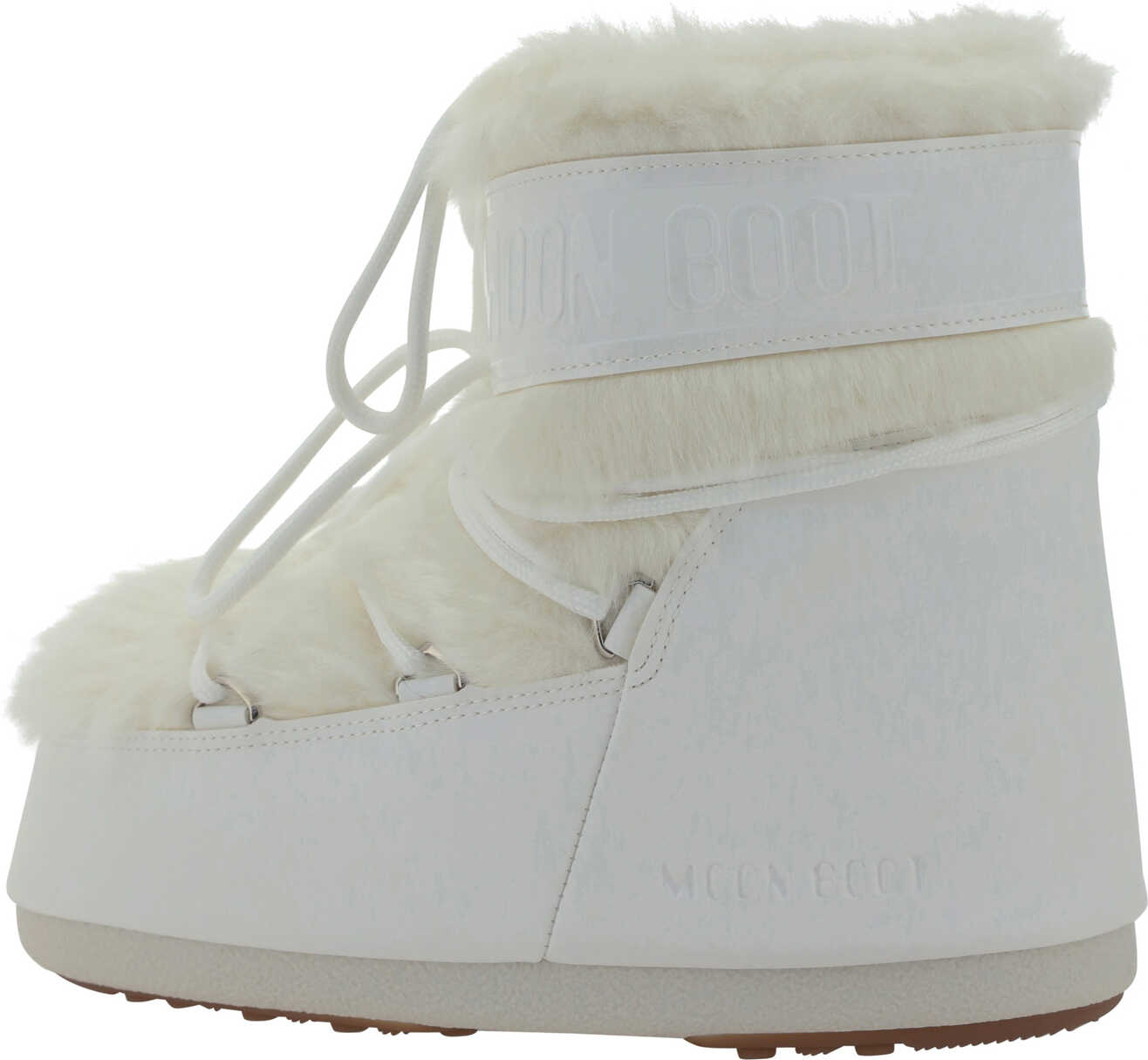 Icon Low Faux Fur boots from Moon Boot, classic all-over padded design, iconic brand monogram printed on the shaft, faux fur trim, front laces for closure, platform sole, ankle-length model.