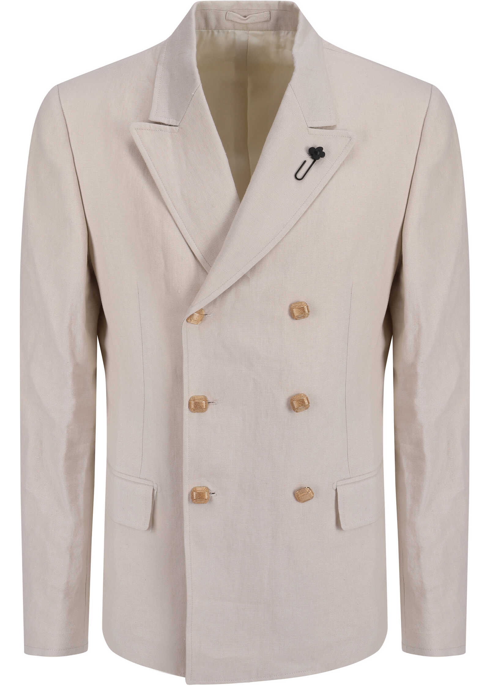 Linen Blazer Jacket by Lardini, double-breasted front button closure, peaked lapels, iconic brand flower appliqué on lapel, two welt pockets with flap appliqué on front, monochrome pattern, regular fit.