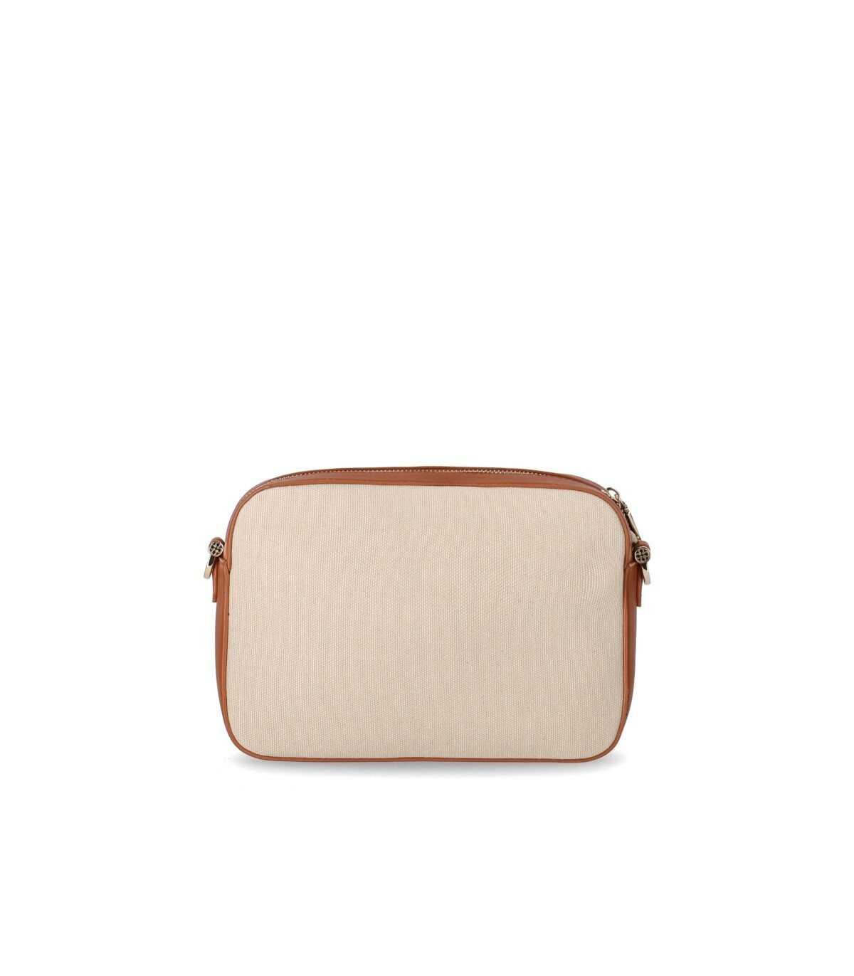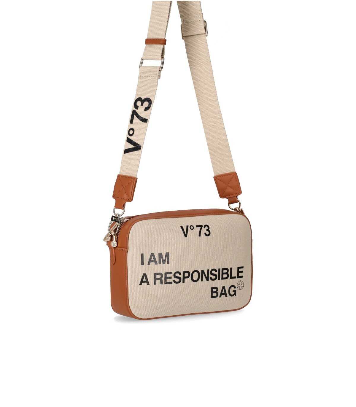 V73 shoulder bag made of cotton canvas in natural tones, decorated with contrasting slogans on the front. Details in gold metal and leather-like inserts in tan color. Lined interior with flat pockets, zip closure, and adjustable and removable shoulder strap. Dimensions 23.5x16.5x6.5 cm.
