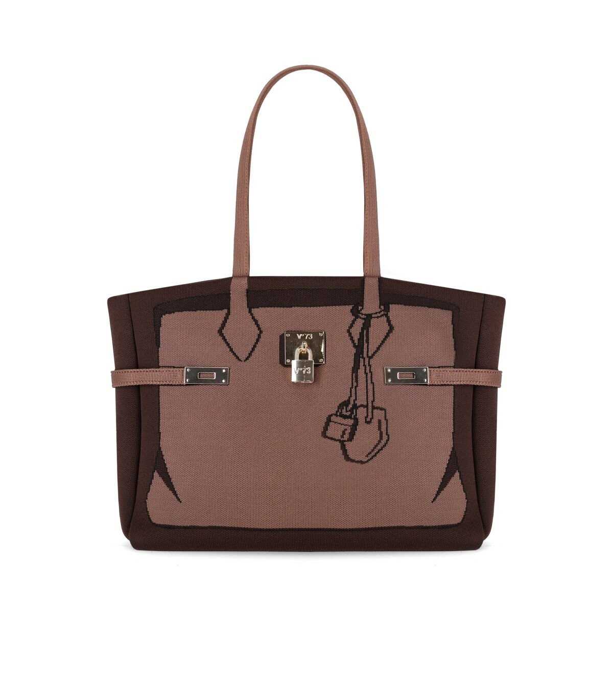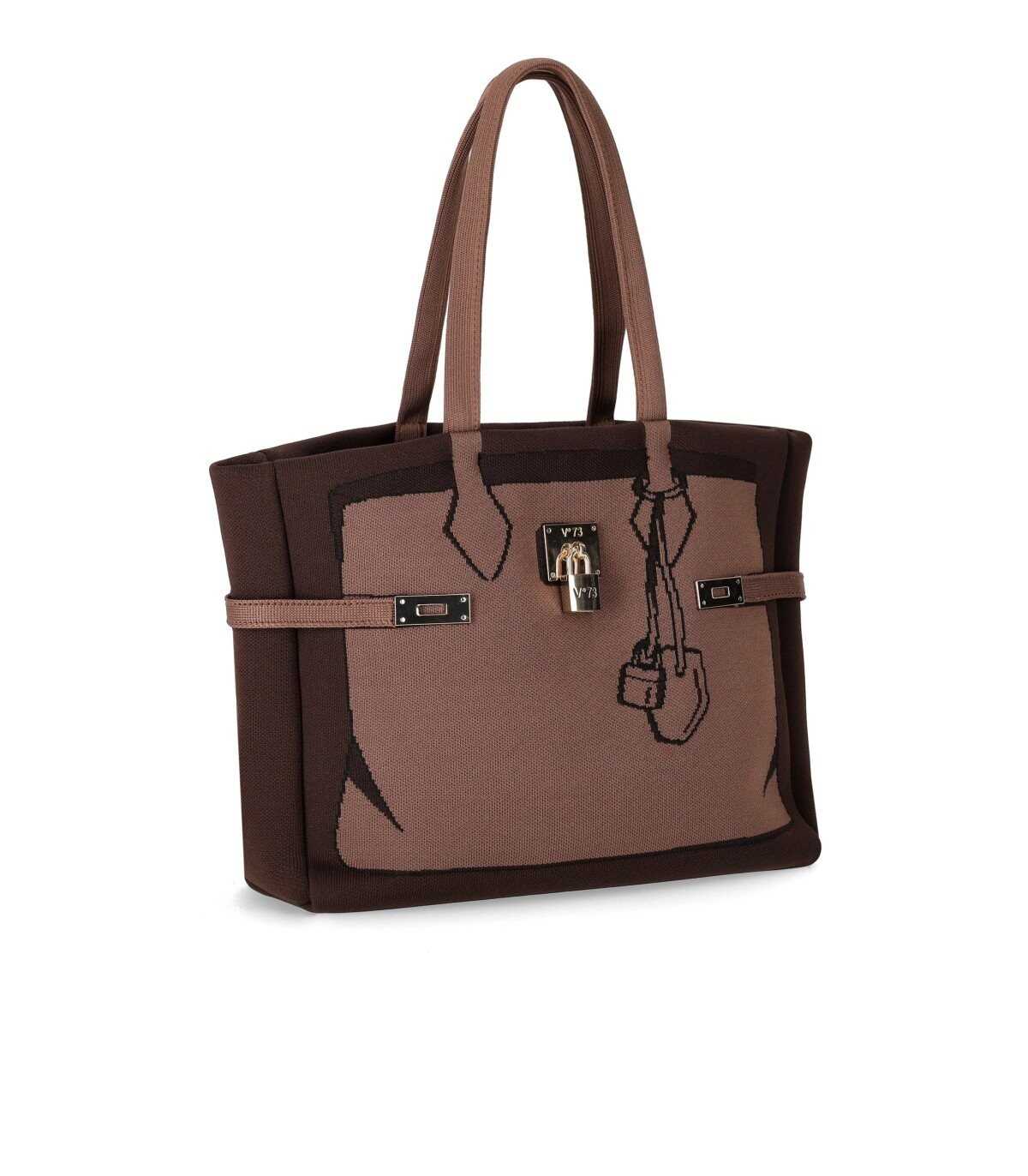 Venere shopping bag by V73 made of fabric in shades of brown, decorated with front graphics and a golden metal lock. Lined interior, equipped with flat pockets and a removable zip pouch. Magnetic closure, dimensions 32x27x11 cm.