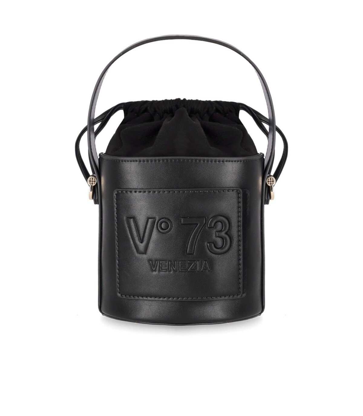 V73 bucket bag made of black eco-friendly material with a leather effect, featuring a suede insert with a drawstring closure. Golden metal details, front logo, and metal feet on the bottom. Adjustable and removable shoulder strap. Dimensions 17x17 cm.