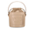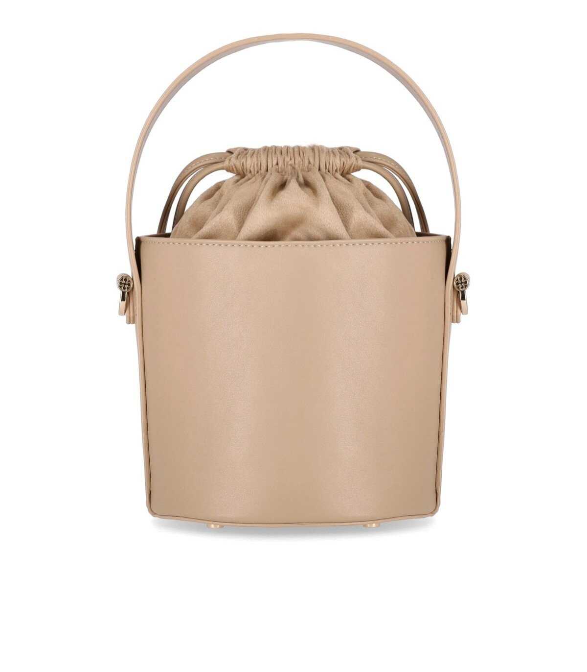 V73 bucket bag made of eco-friendly leather-like material. Suede-effect insert with drawstring, gold-tone hardware, and embossed logo on the front. Metal feet on the bottom, adjustable and removable shoulder strap. Dimensions 17x17 cm.