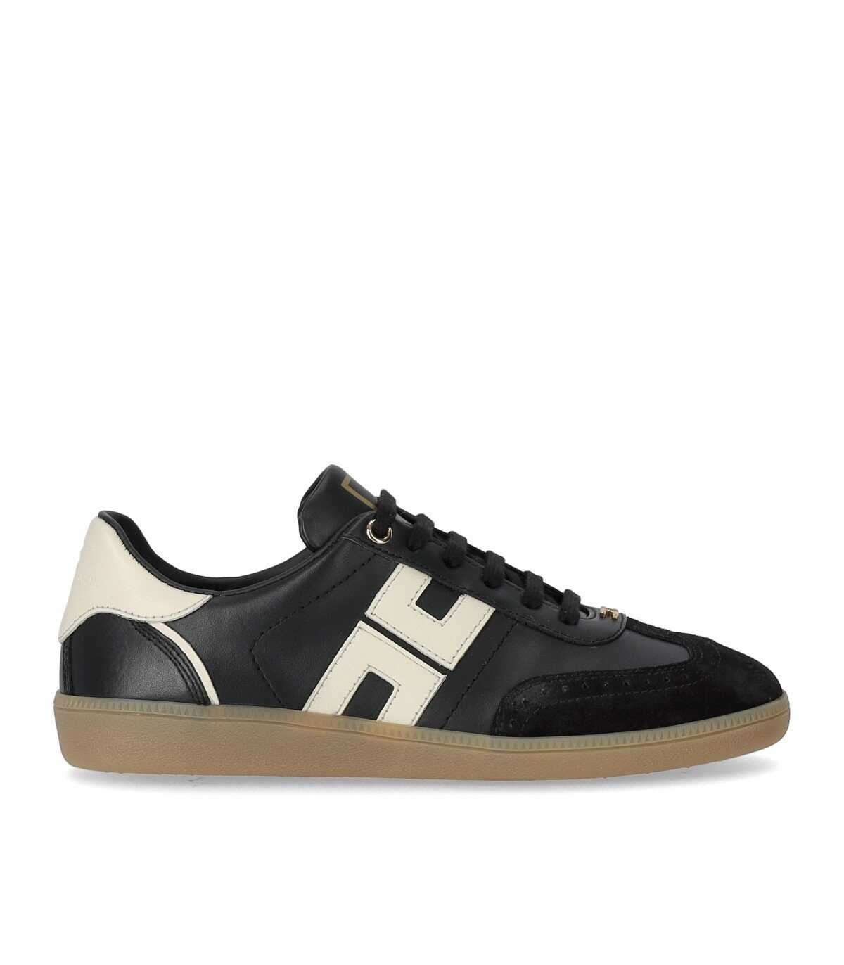 Sneaker by Elisabetta Franhi made of leather and suede in shades of black, decorated with a contrasting logo on the sides. Tongue with a golden emblem, leather interior, and black cotton laces. Rubber sole, height 2.5 cm. Composition: 100% leather.