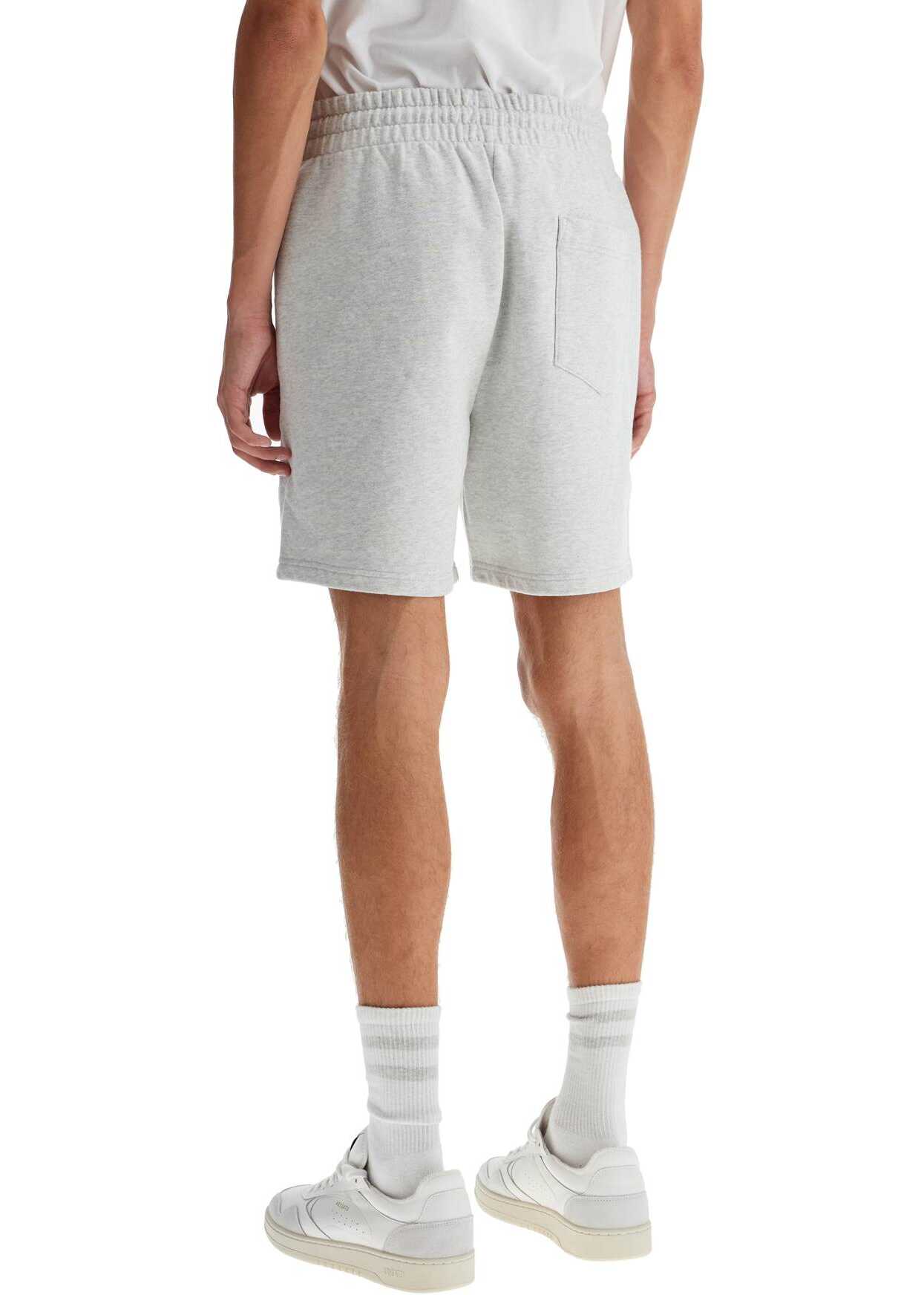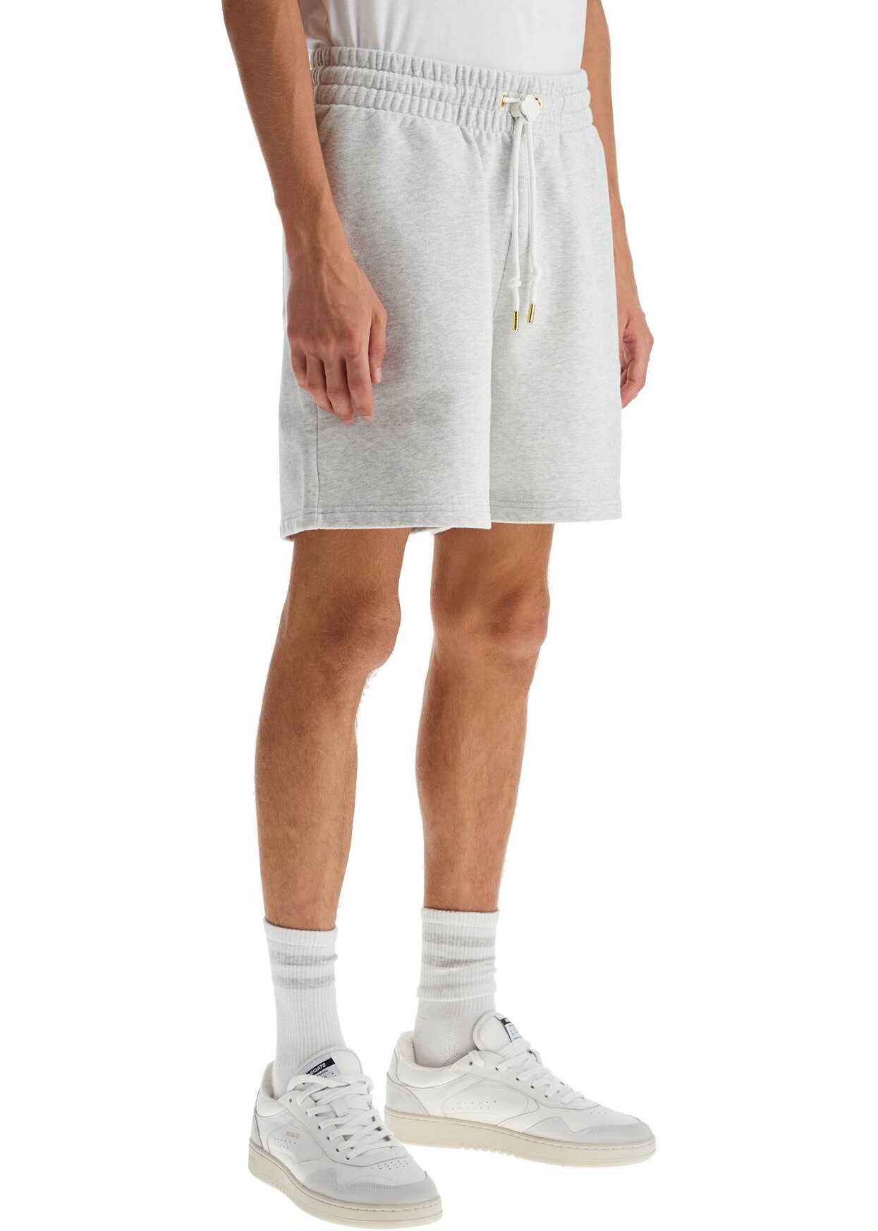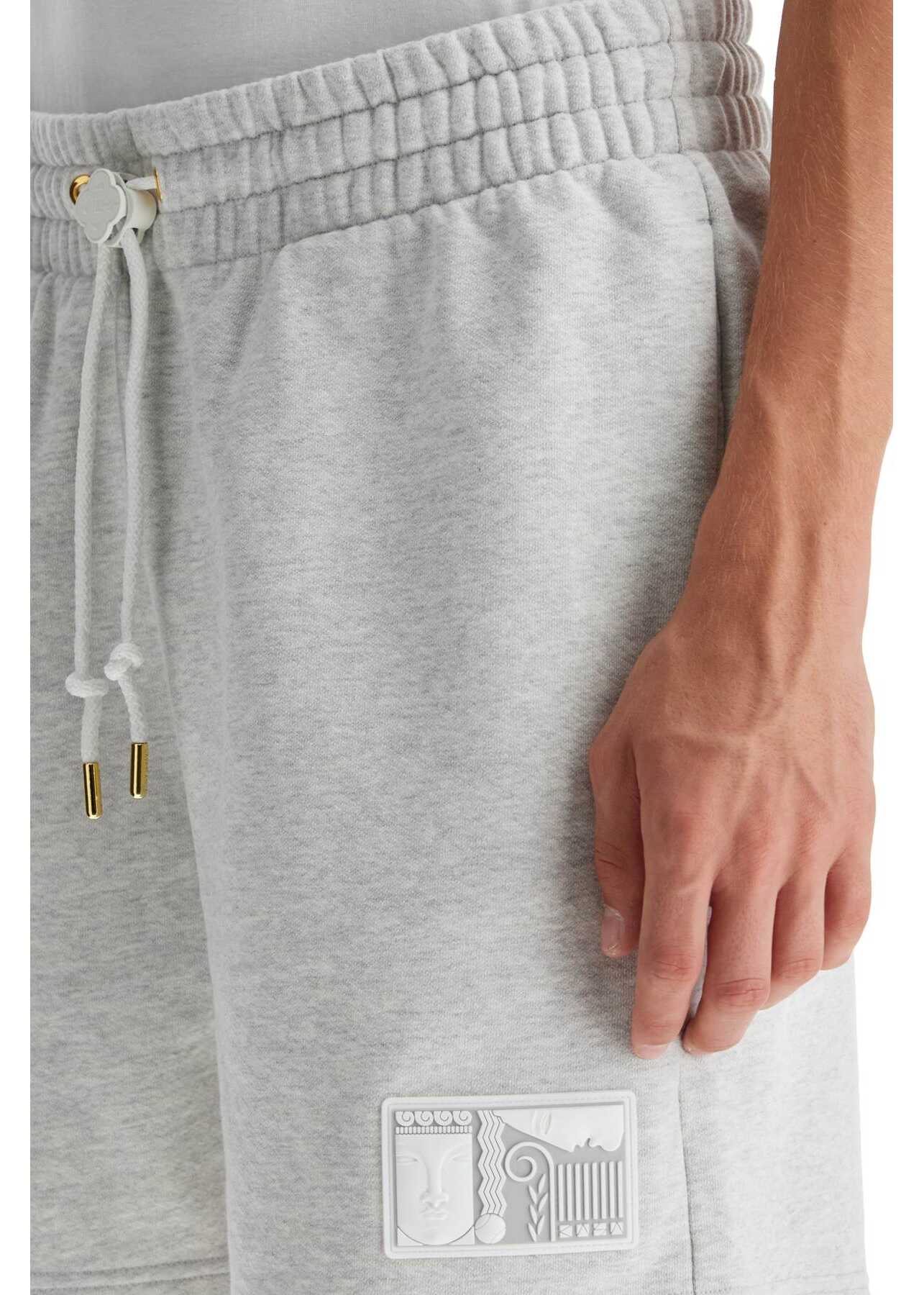 Casablanca sporty Bermuda shorts made of organic French terry cotton with 'Tennis Statues' rubber patches on the bottom. Featuring two side pockets and one back pocket, they are finished with an elastic waistband and a drawstring with logo stoppers. The model is 187 cm tall and wears size M.