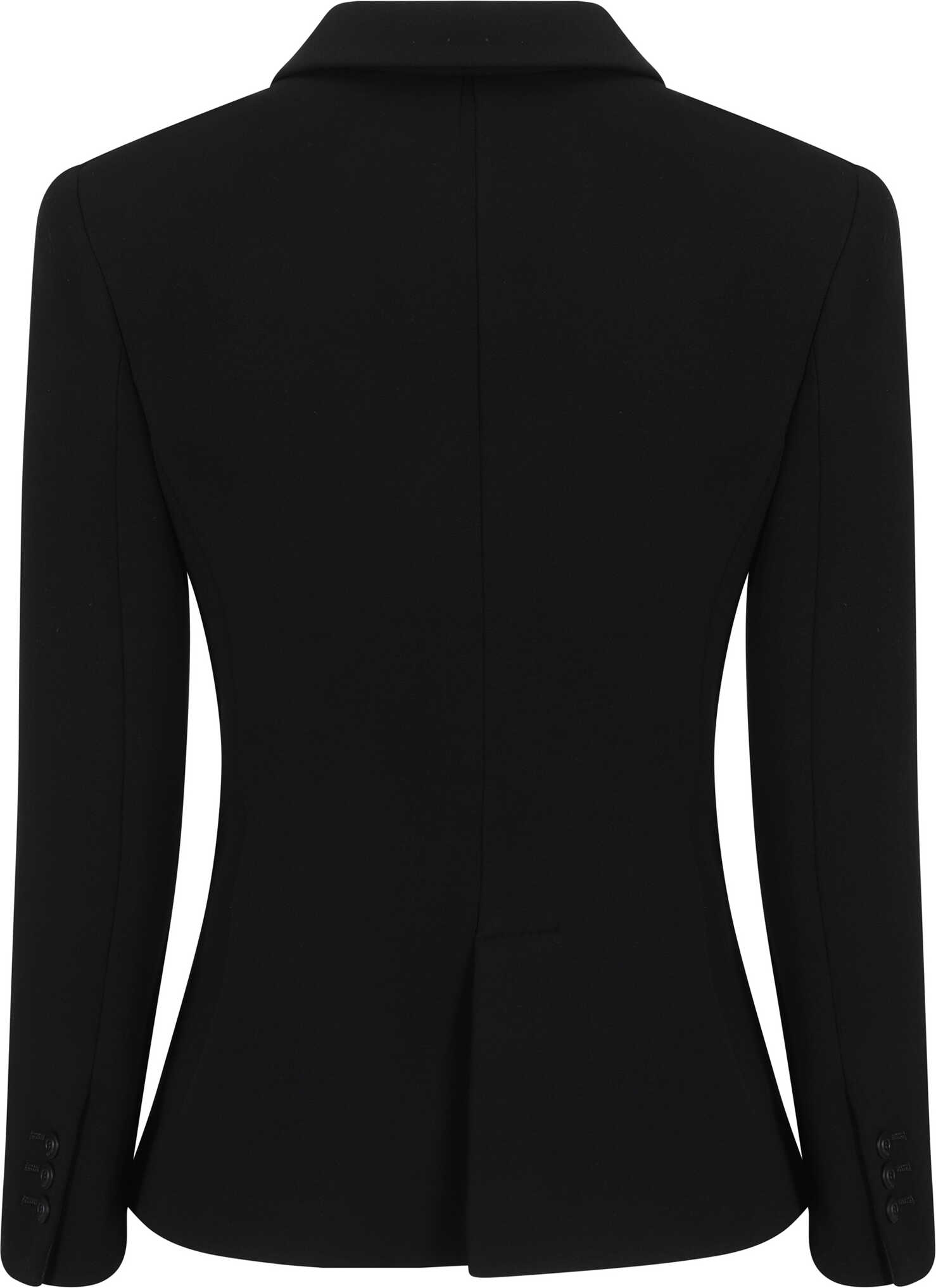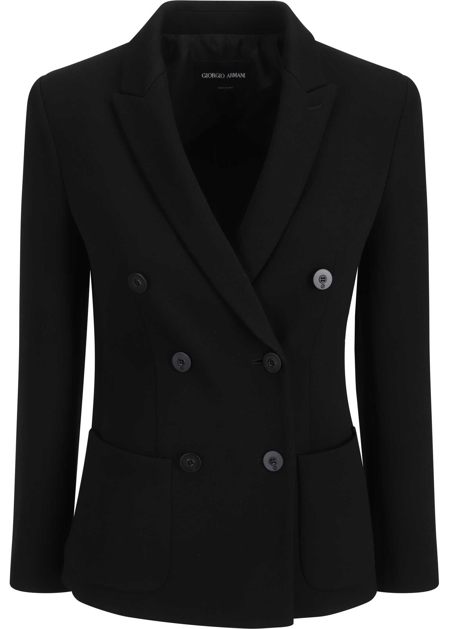 Virgin Wool Blazer Jacket by Giorgio Armani featuring a double-breasted front button closure, spear lapels, two front patch welt pockets, a front welt pocket, a back slit, structured shoulders, and a regular fit.