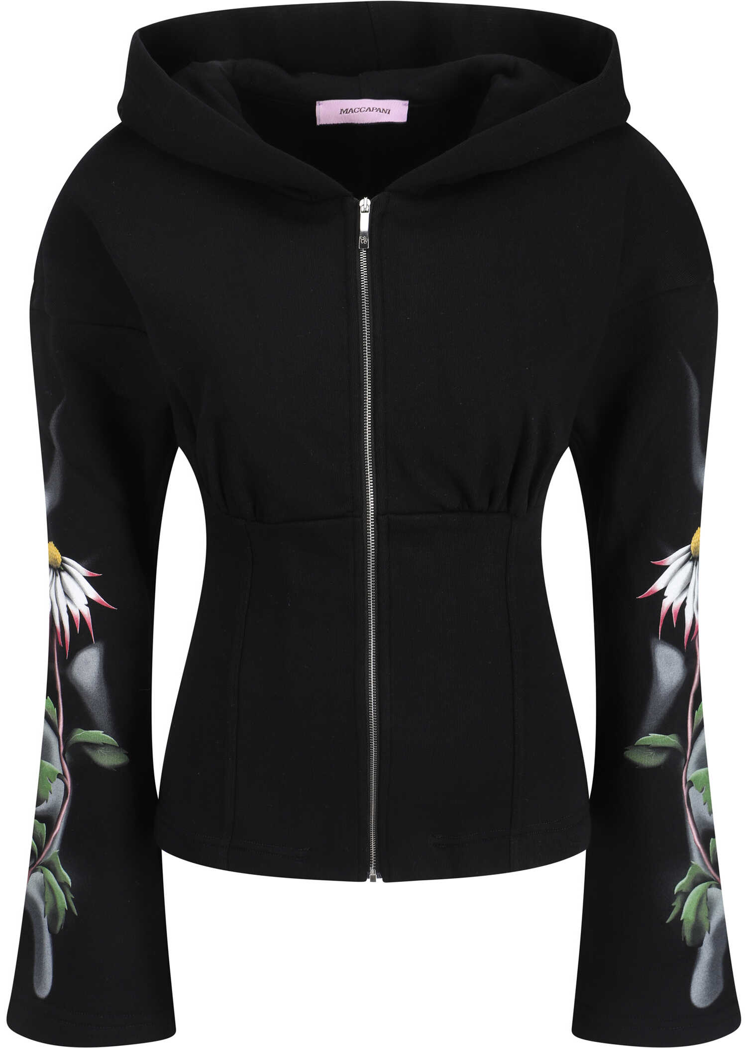 Hoodie Hoodess by Maccapani, zipper closure, wide sleeves, floral patterned detail printed on sleeves, close fit at bottom and regular fit at top.