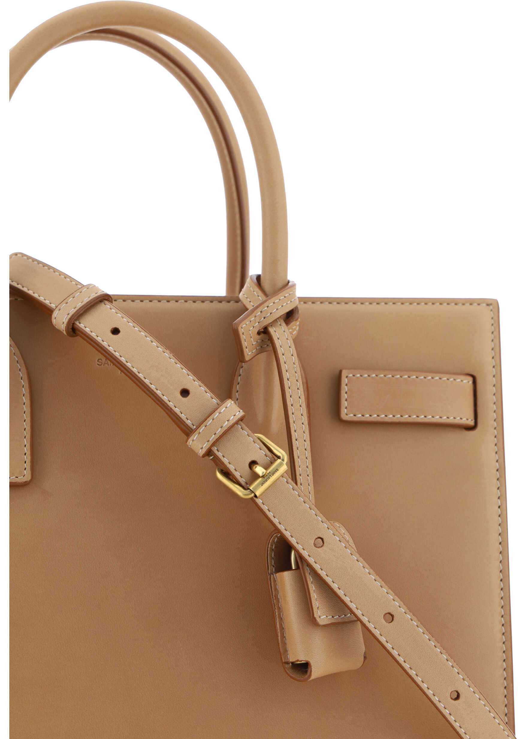 Leather Handbag Saint Laurent, front martingale detail with swivel hook, double rigid and tubular top handles, removable and adjustable flat shoulder strap, smooth leather design, double interior compartment with zippered clutch, side gussets, flaps with snap closure, removable brass padlock, iconic brand signature press-stamped on front.