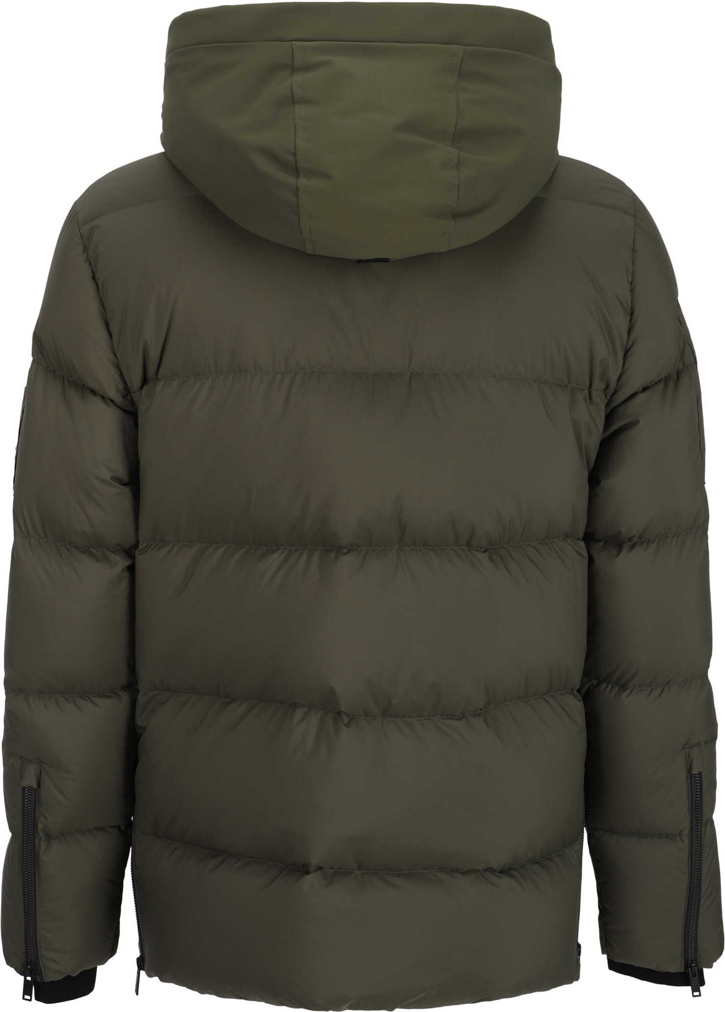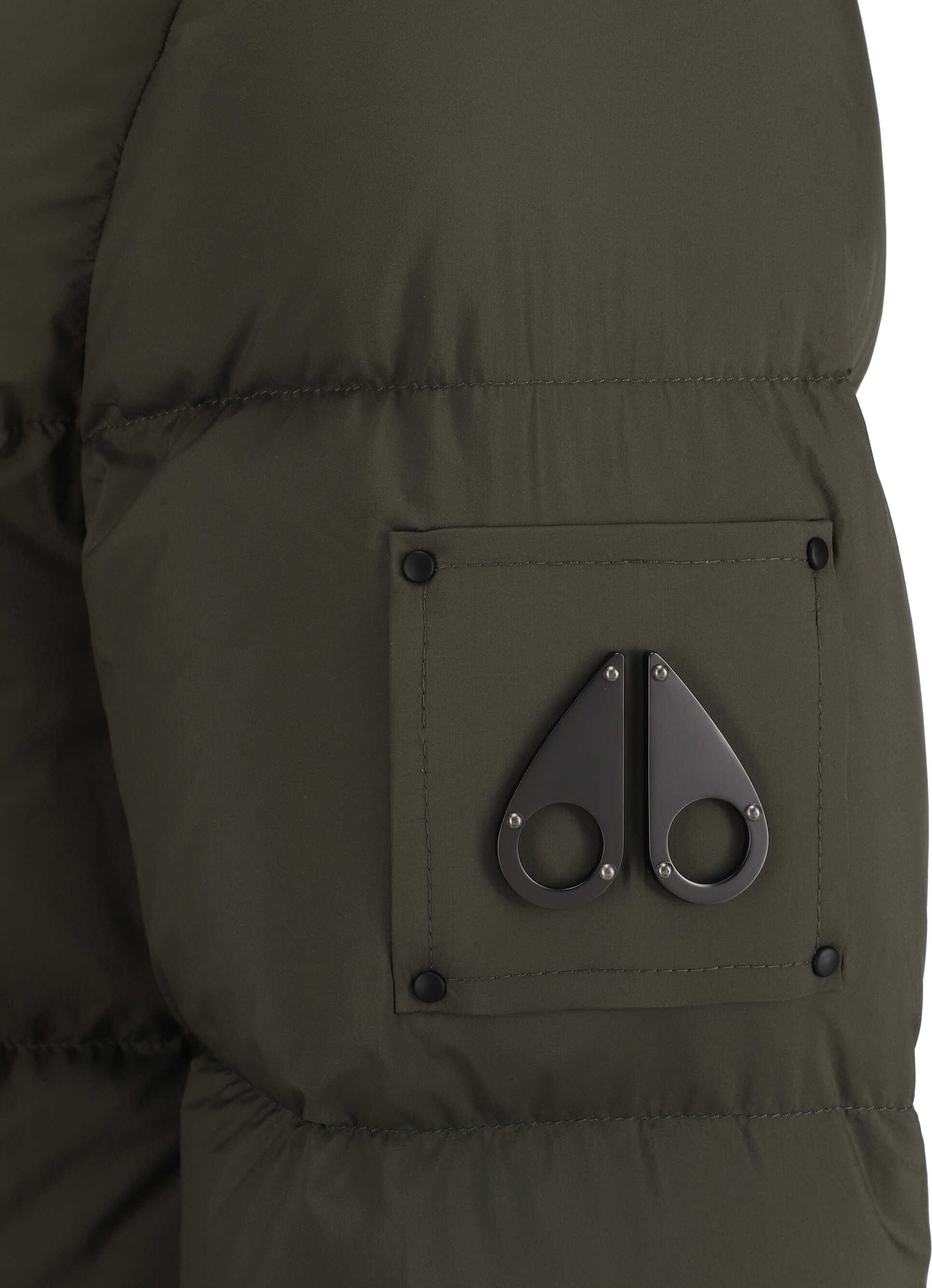 Everest Down Jacket by Moose Knuckles, design with adjustable hood with drawstring and removable by buttons, high collar, front zipper and button flap closure, two side welt pockets with flap applique, vertical slit pocket with zipper on front, zippered patch pocket on right sleeve, all-over quilted and padded design, elastic ribbed cuffs, adjustable side slits with zipper, iconic brand logo metal plaque appliqué on left arm, regular fit.