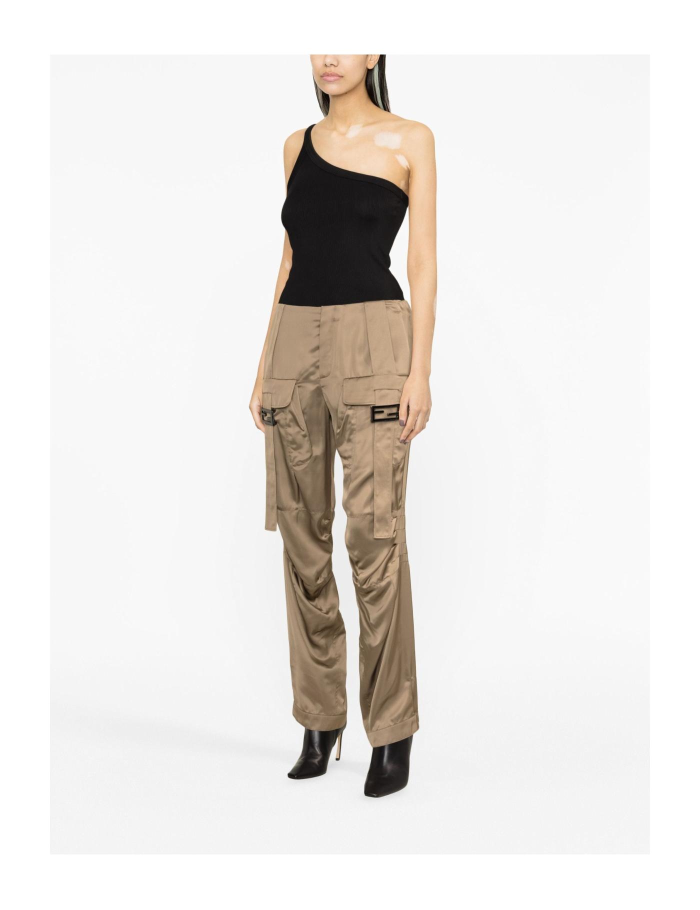 Fendi puts an elevated Italian spin on the utilitarian cargo trouser, adding gunmetal-tone FF Baguette buckles at the non-functioning straps that dangle from the flap pockets of this satin pair. Pleats at the knees creates a fluid drape though the relaxed straight legs.
