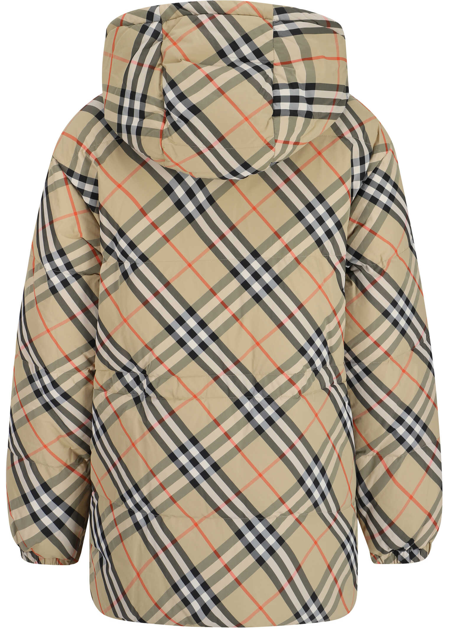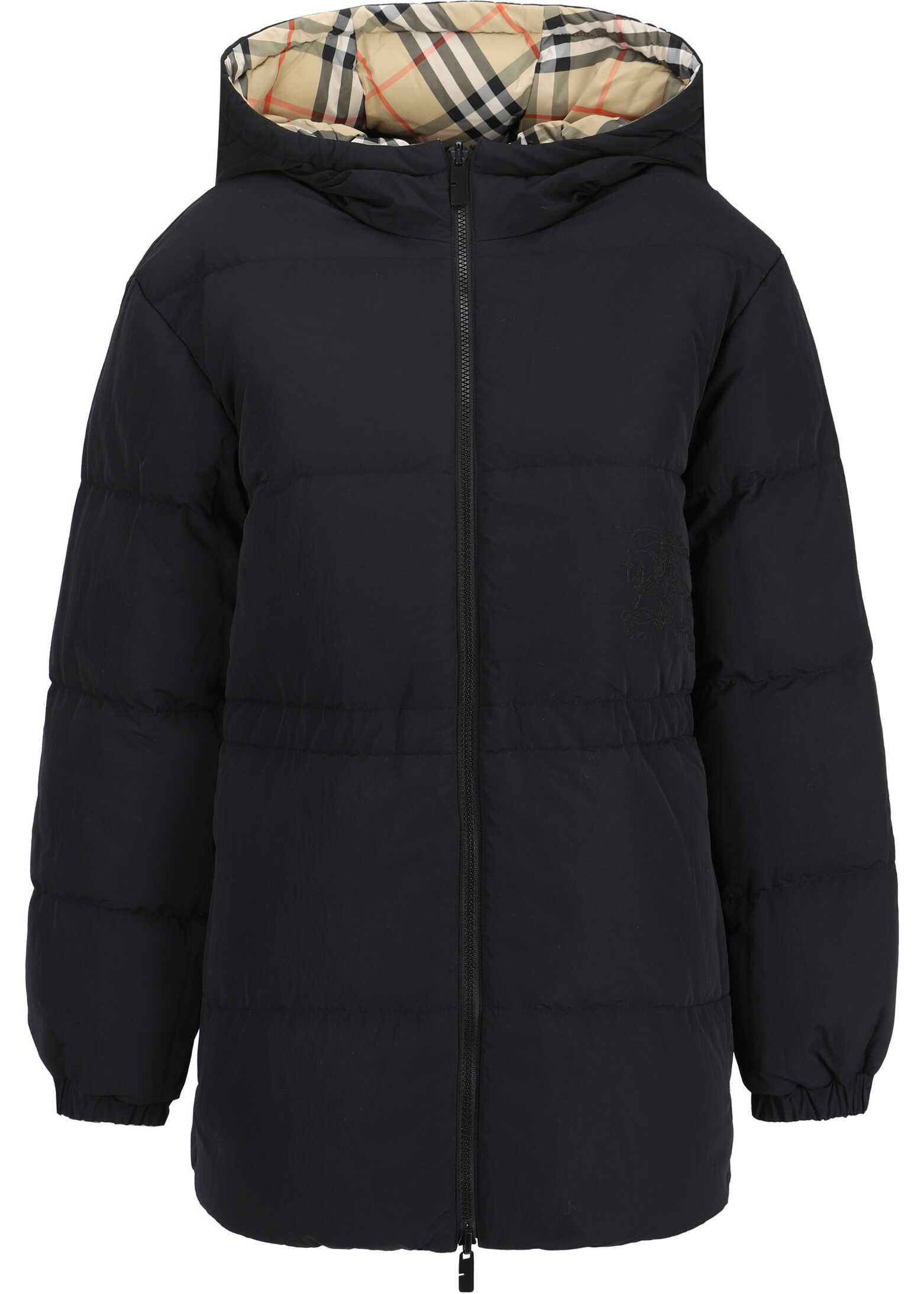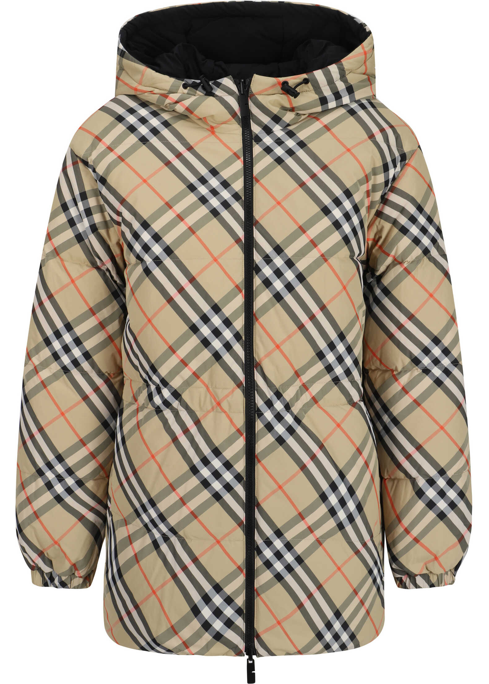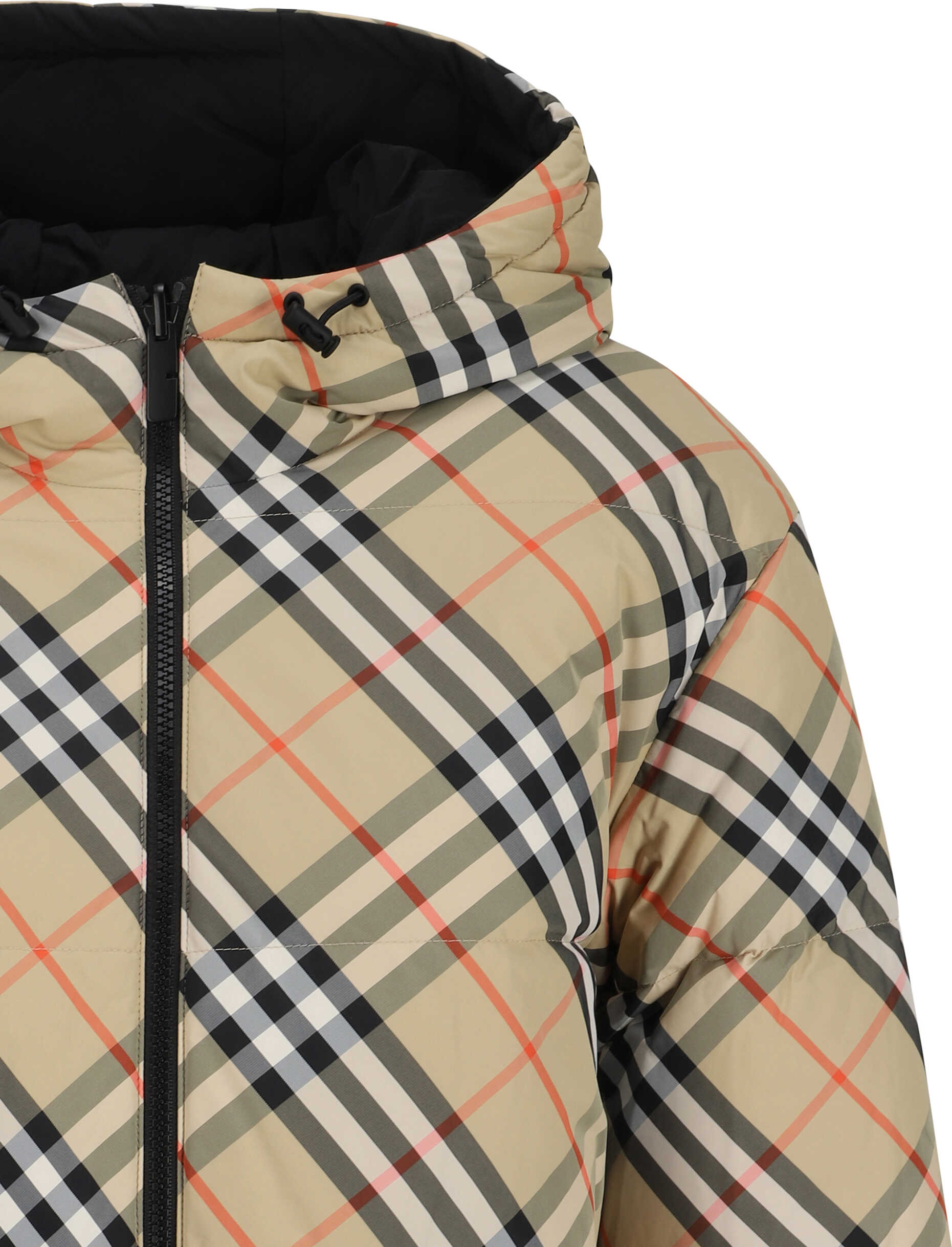 Reversible Down Jacket from Burberry, model with drawstring-adjustable hood, double-slider front zipper closure, two zippered closable welt side pockets, elasticized cuffs, iconic all-over printed Archivio Check pattern on one side, monochrome pattern on the opposite side, over fit.