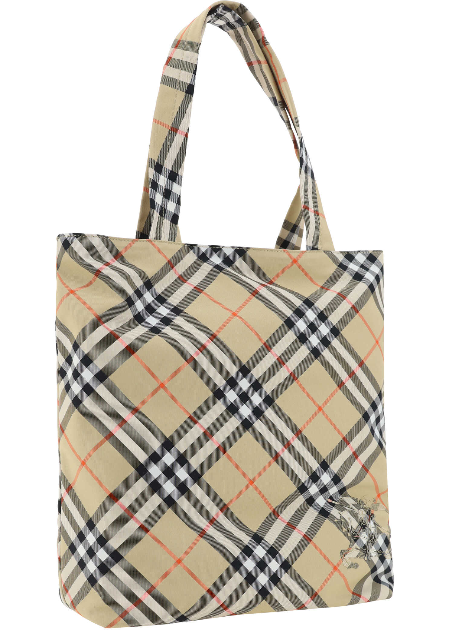 Shoulder Bag by Burberry, two flat top handles, zipper closure at top, single interior compartment, iconic all-over repeated Check Archivio pattern, iconic contrasting embroidered The Equestrian Knight logo on front,