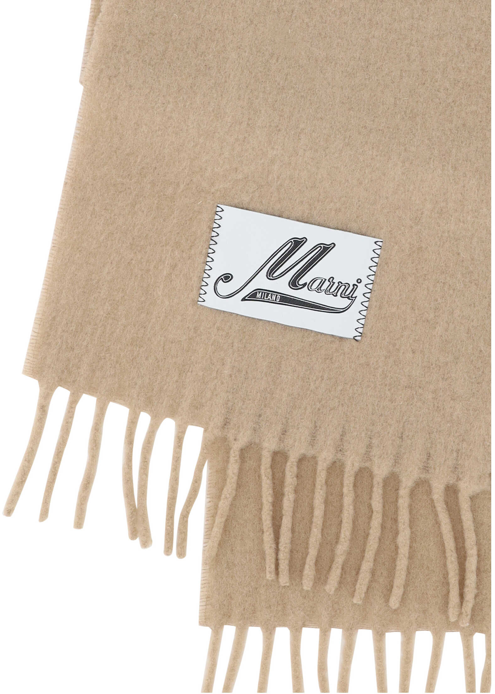 Alpaca Wool Scarf by Marni, fringed edges, monochrome pattern, logo patch in embroidered fabric on the front.
