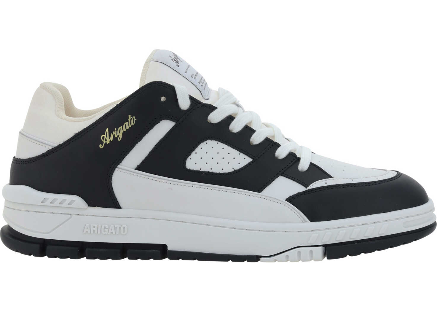 Leather Area Sneakers by Axel Rigato, round toe, flat sole, front lace-up closure, contrasting paneled design, iconic brand monogram patch applied on tongue, iconic brand signature pressure-printed on side panel.
