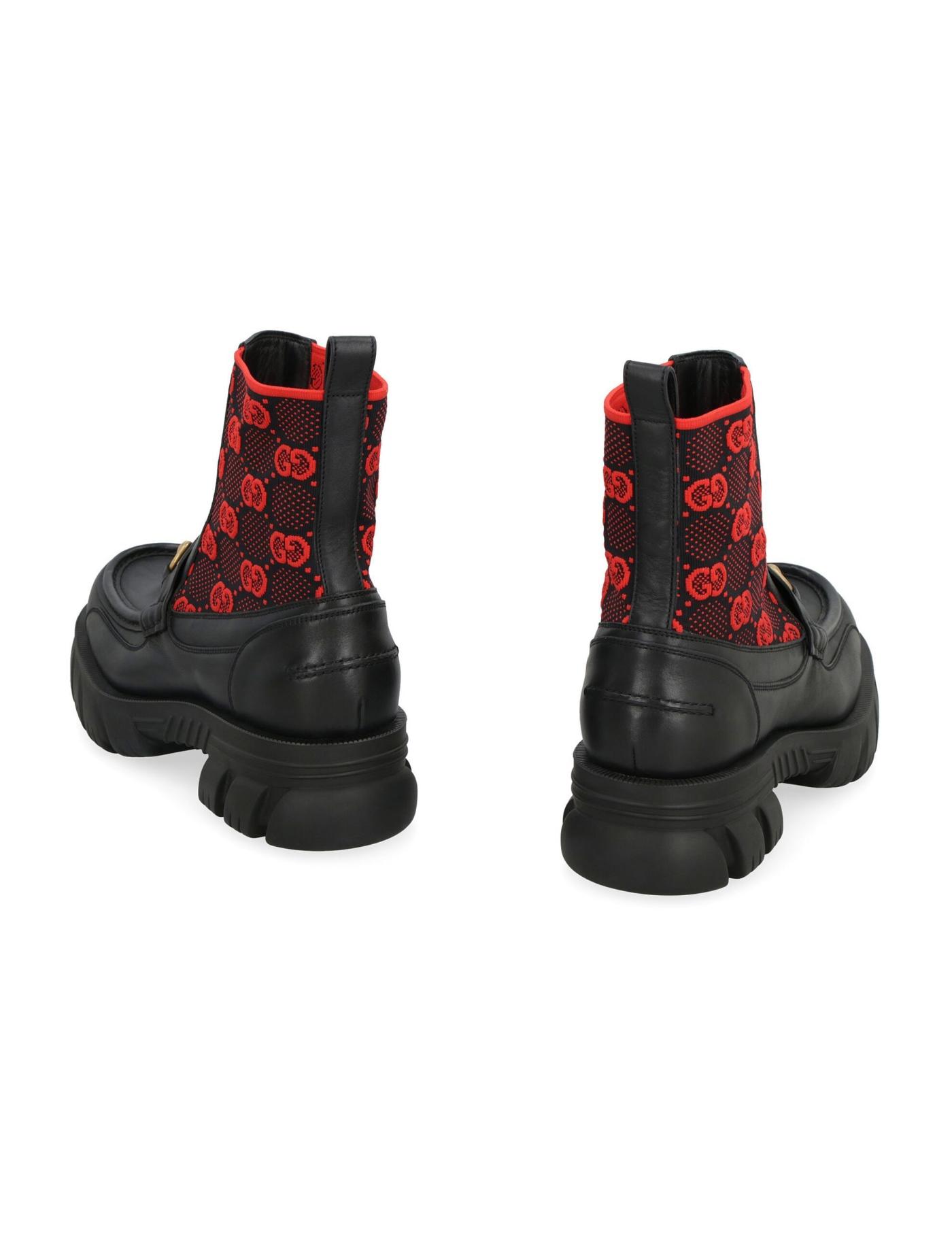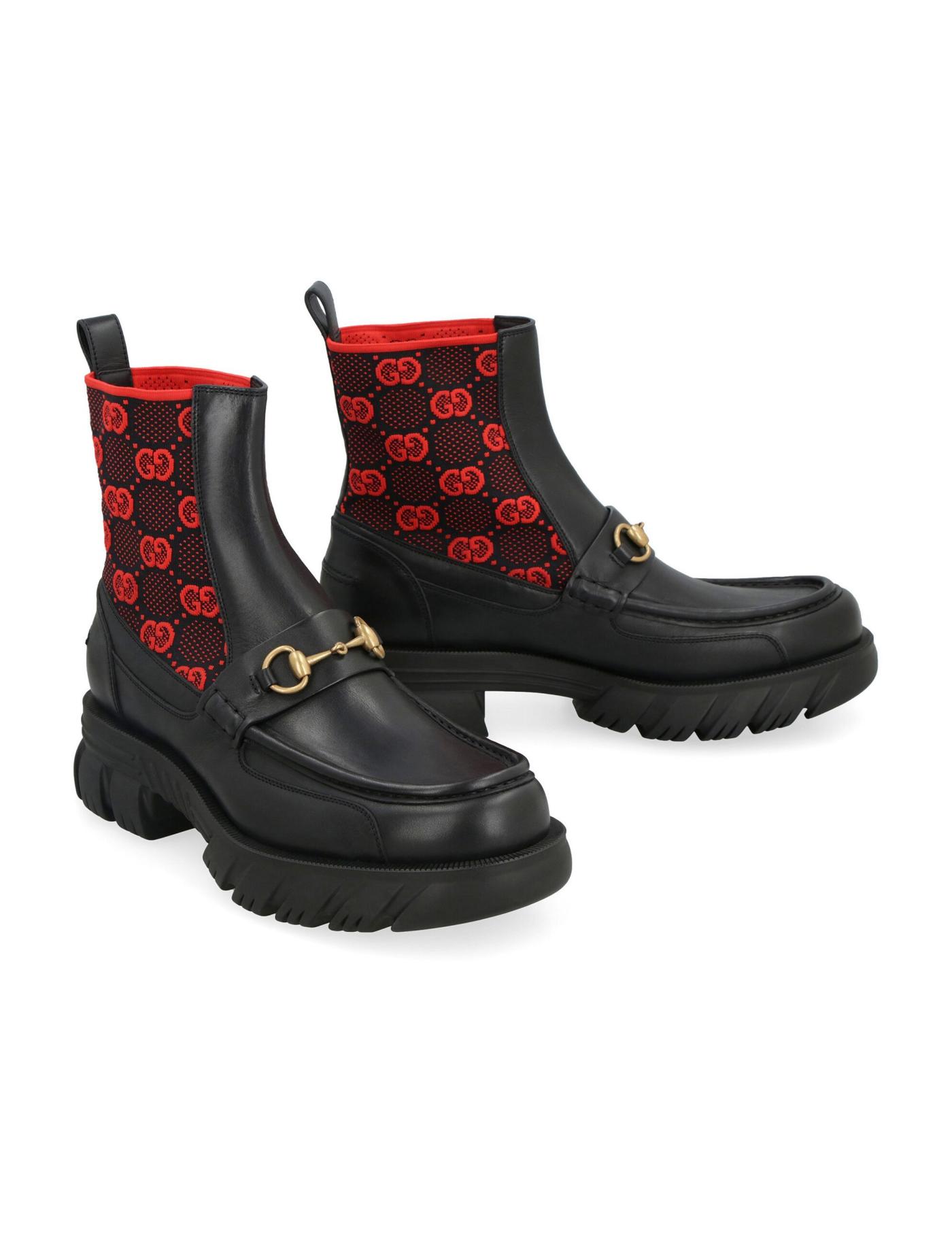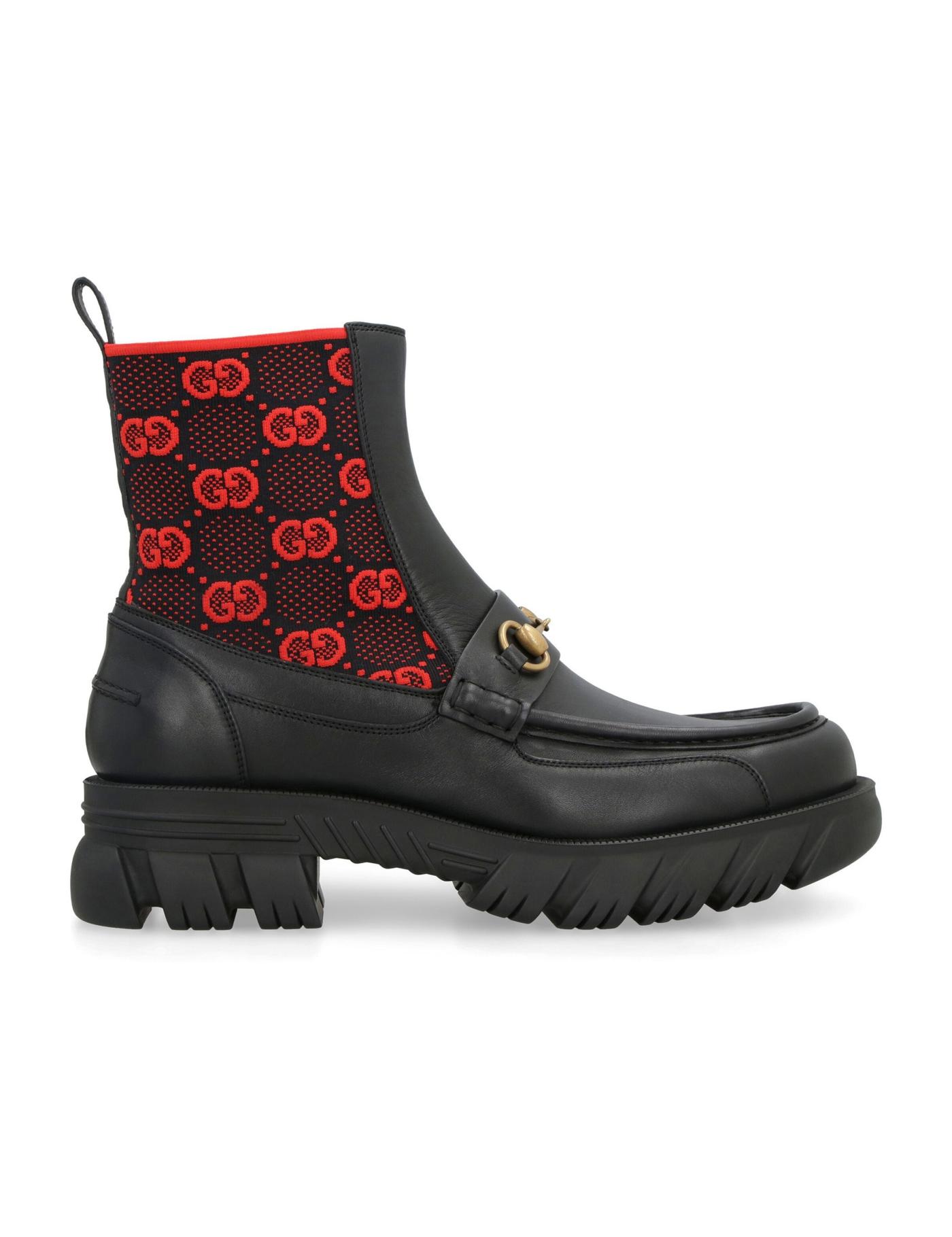 Gucci's SS23 collection includes this pair of ankle boots, which are detailed with signature hallmarks of the label. Crafted from black leather, the pair feature a red stretch-jersey insert patterned with the GG logo alongside gold-tone Horsebit hardware across the toe and a chunky rubber outsole.
