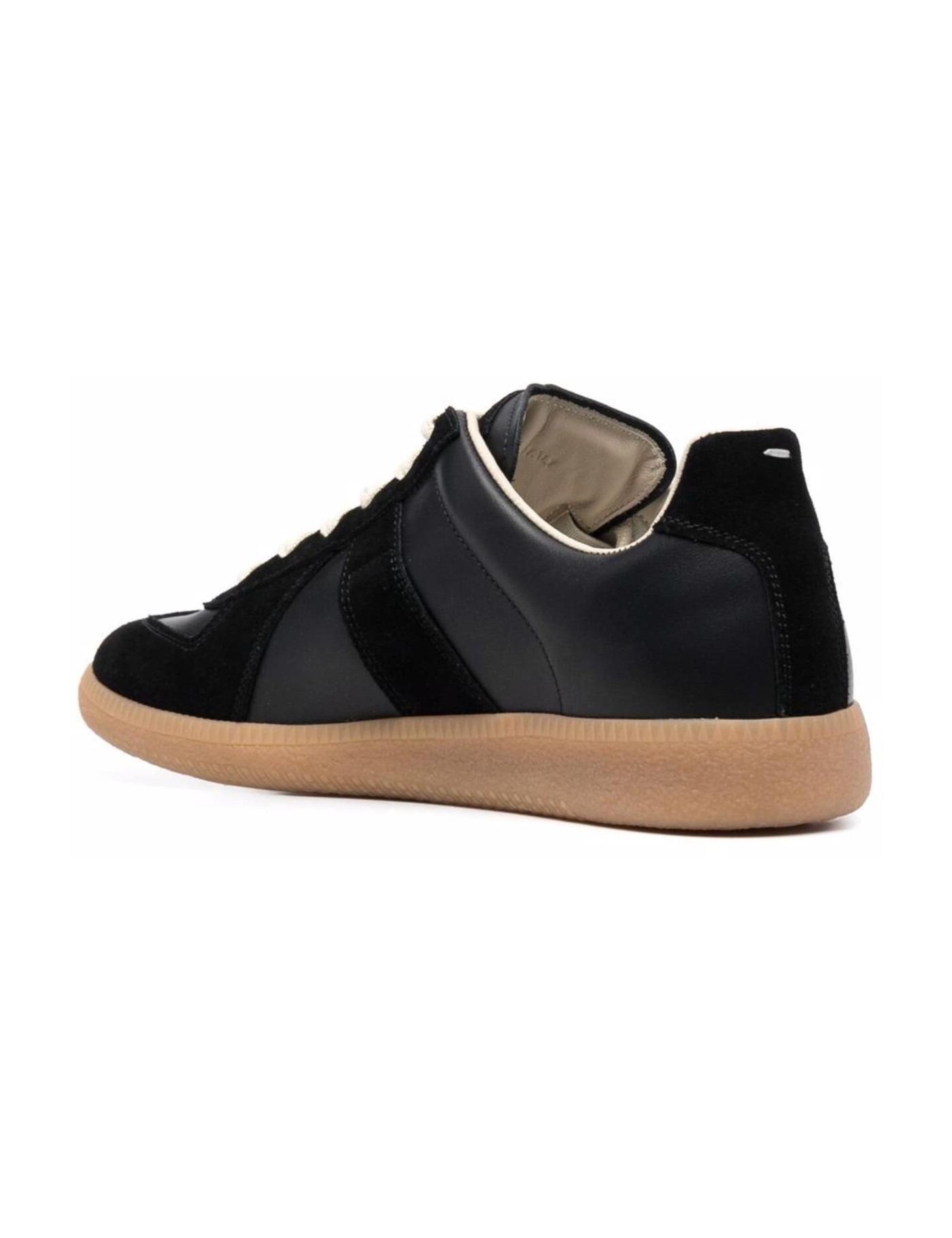 - Black leather/rubber Replica low-top sneakers from Maison Margiela featuring logo patch at the tongue, front lace-up fastening, round toe and flat sole.
