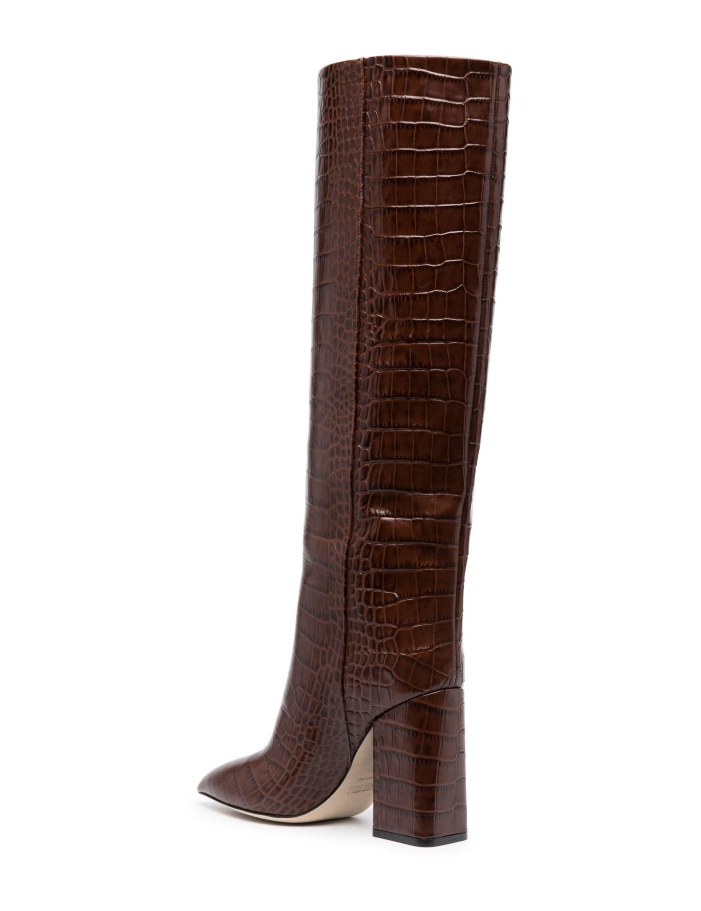 Rendered in chocolate-brown calf leather, these Paris Texas boots are defined by their knee-high barrel shaft and embossed crocodile finish. Towering block heels elevate the look and provide support all day long.