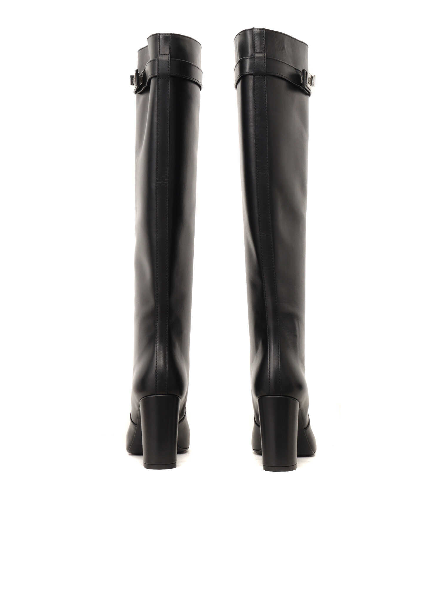This black boot, featuring a decorative strap, offers a versatile and contemporary design. The leather and rubber sole ensures long life and a comfortable fit.