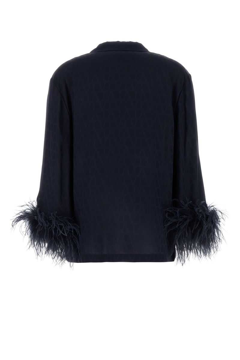 Valentino GARAVANI navy blue silk VLogo Signature notched collar front button fastening long sleeves feather-trim detailing straight hem The full look includes accessories.