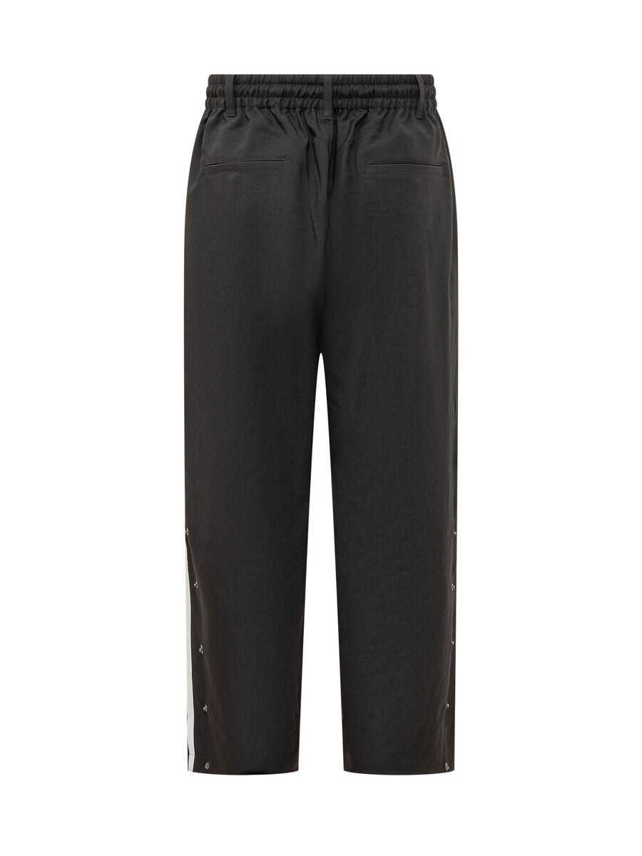 Black long pants. Buttons on the fonto. Elasticized waistband. Pasasnti for belt. Button, zipper and drawstring closure.