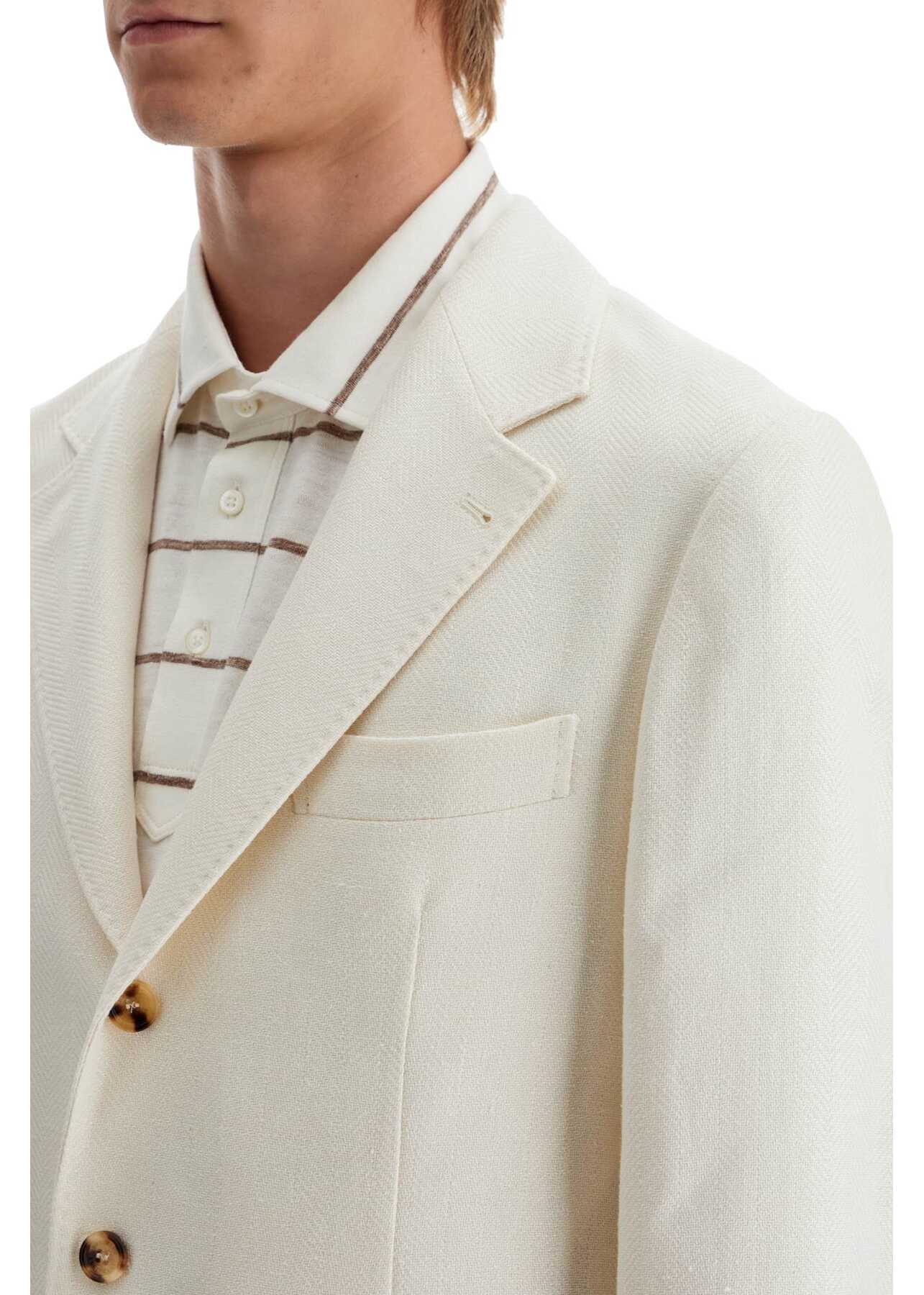 Crafted from a luxurious chevron fabric made of linen, silk, wool, and cotton, this Brunello Cucinelli blazer features a deconstructed three-button design with classic lapels, three flap pockets, a chest pocket, and two back vents. It has a slim fit and is partially lined. The model is 187 cm tall and wears an Italian size 48.