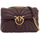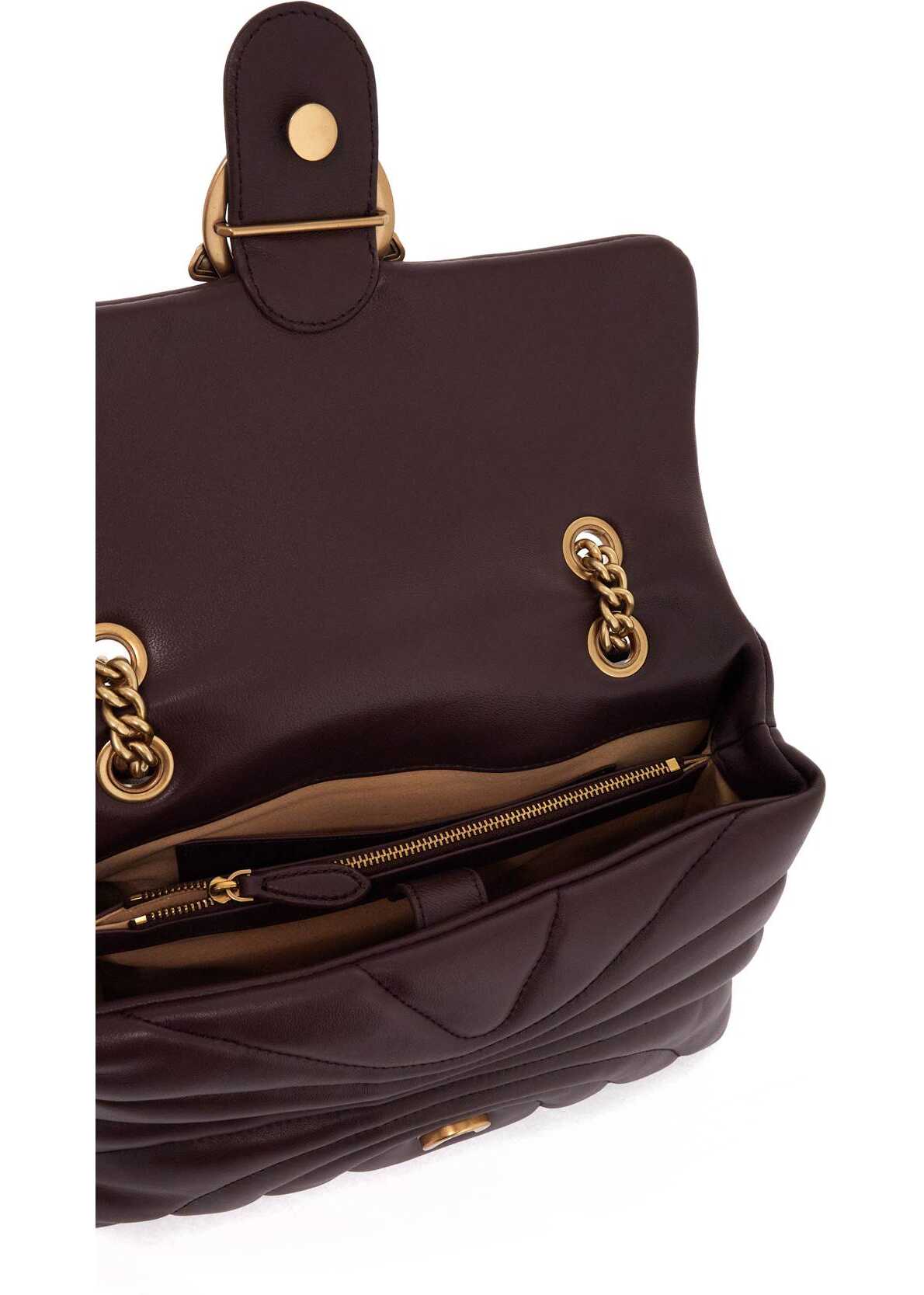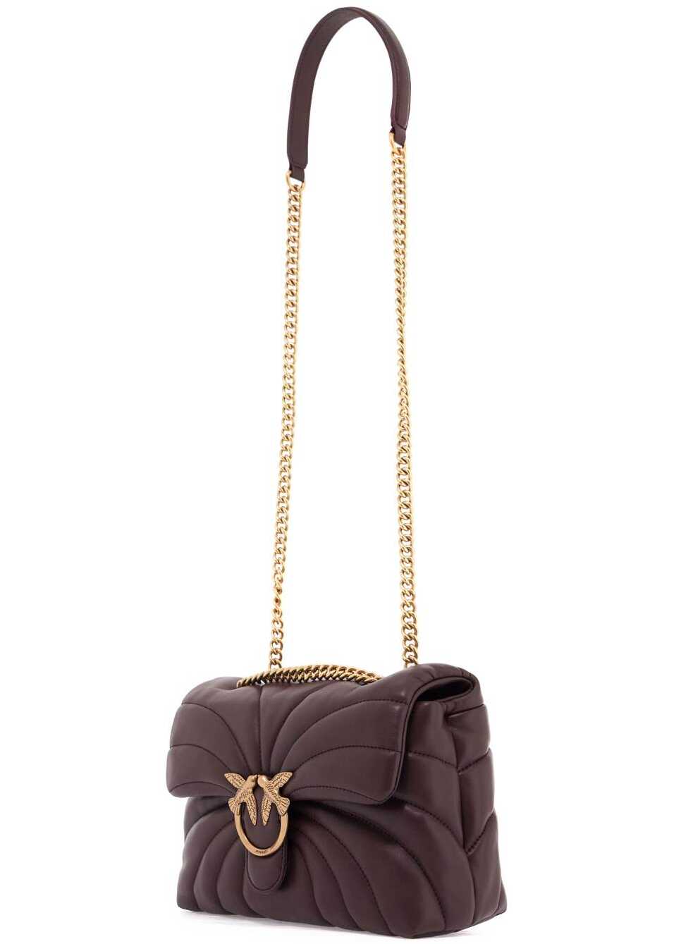 The Pinko Love Classic Puff Butterfly Quilt bag is made of soft nappa leather with a semi-circular quilted pattern that converges towards the iconic metal buckle featuring the Love Birds logo. It can be worn as a handbag, shoulder bag or crossbody thanks to the chain strap with sliding leather insert and double handle. The bag has a snap closure and embroidered Birds design on the back. The interior is lined with microfiber and features a flat leather pocket and two compartments separated by