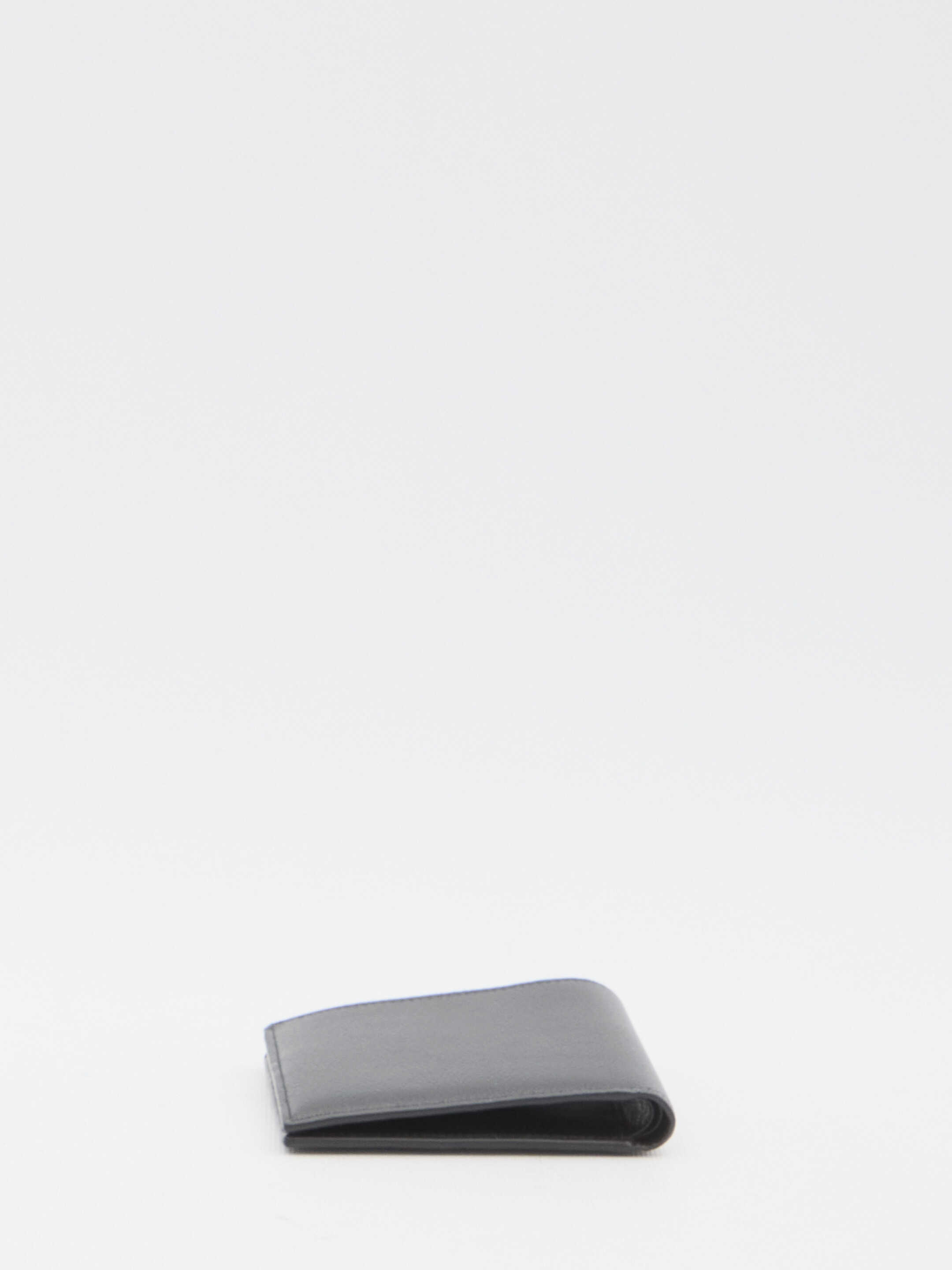 Cash square wallet in black grained calfskin with Political Stencil logo printed on the front. It features two bill compartments, eight card slots and two additional flat pockets. Any leather imperfections are not to be considered manufacturing defects, but a peculiarity of the material.