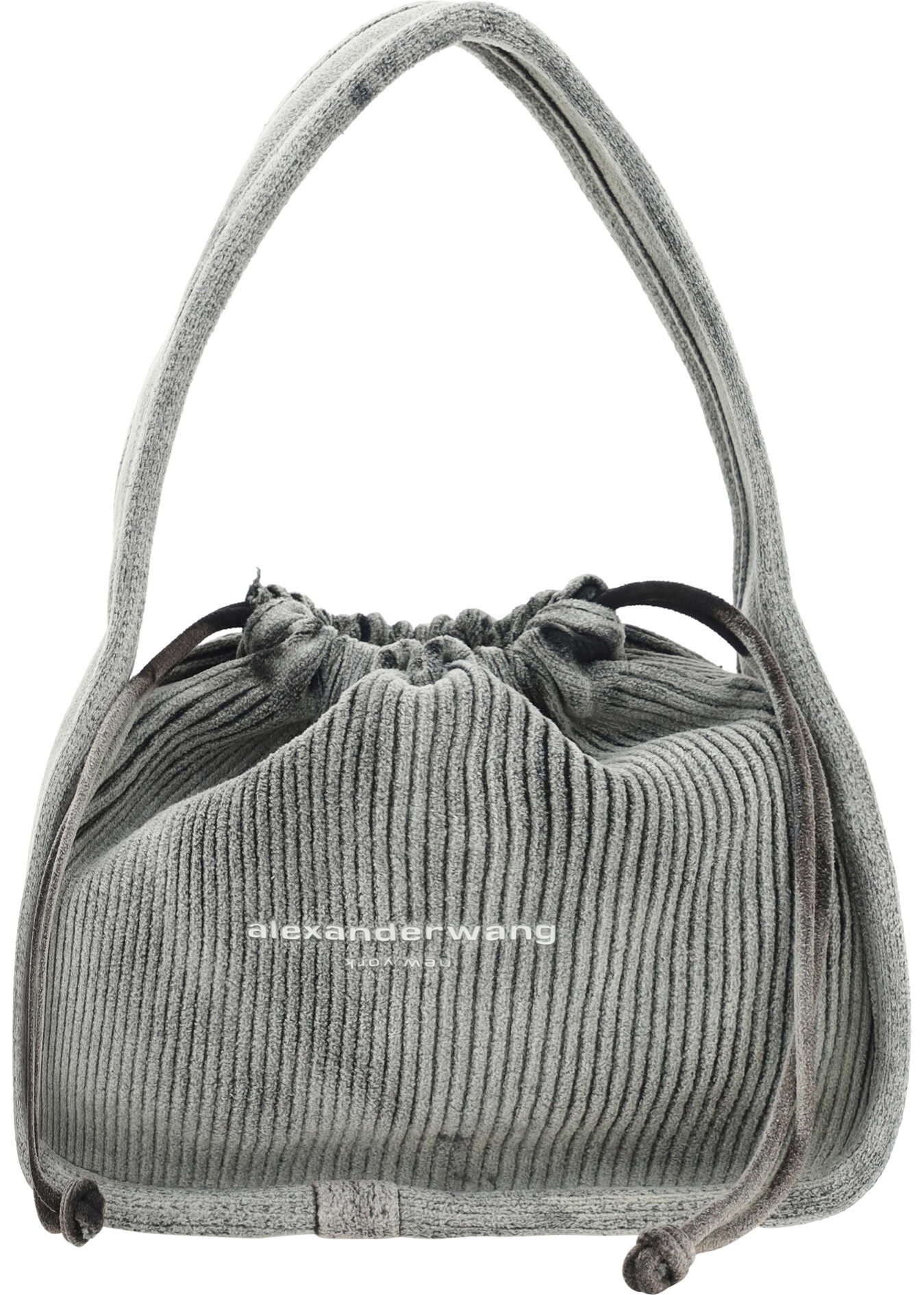 Ryan Small Handbag by Alexander Wang, a flat top handle, drawstring top closure with ribbons, ribbed design, iconic brand monogram printed on the front.