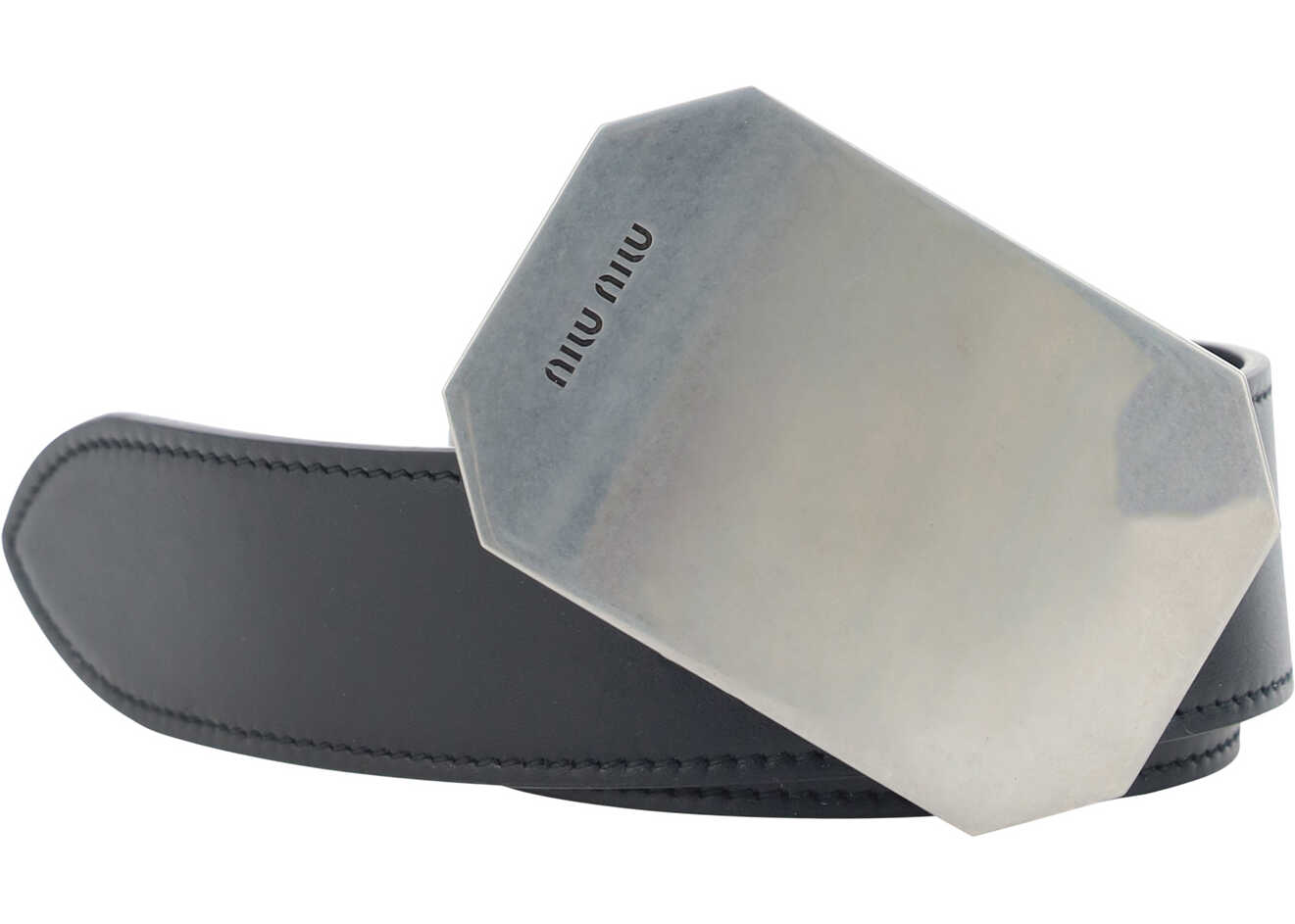 Leather Belt by Miu Miu , elongated octagonal buckle with iconic brand monogram engraved.