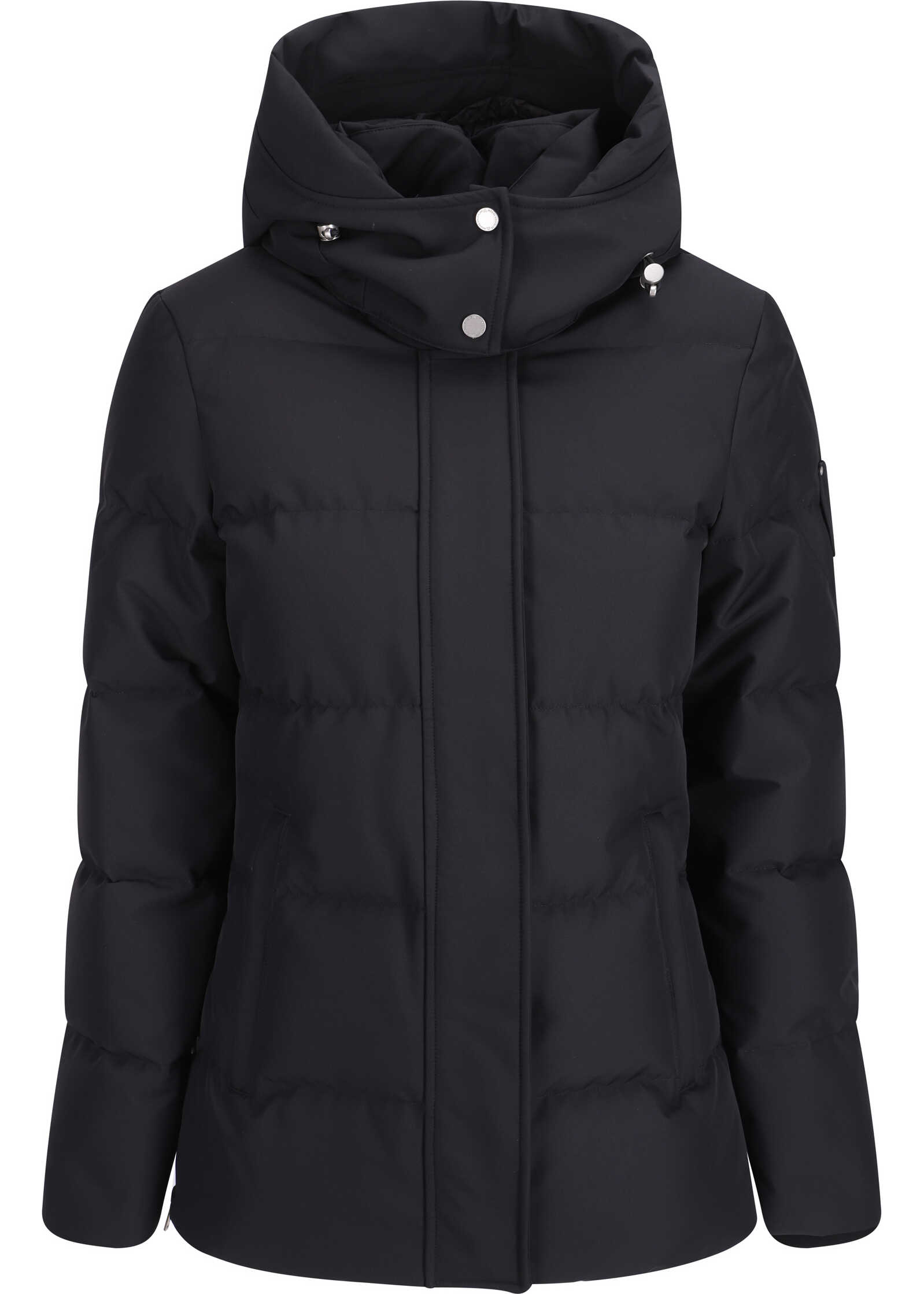 Cloud Down Jacket by Moose Knuckles, design with removable, drawstring-adjustable hood, front closure with double-slider zipper and snaps, two zippered side welt pockets, all-over quilted and padded design, elastic ribbed cuffs, two adjustable side slits with zipper, regular fit, patch with iconic brand monogram applied on left arm.