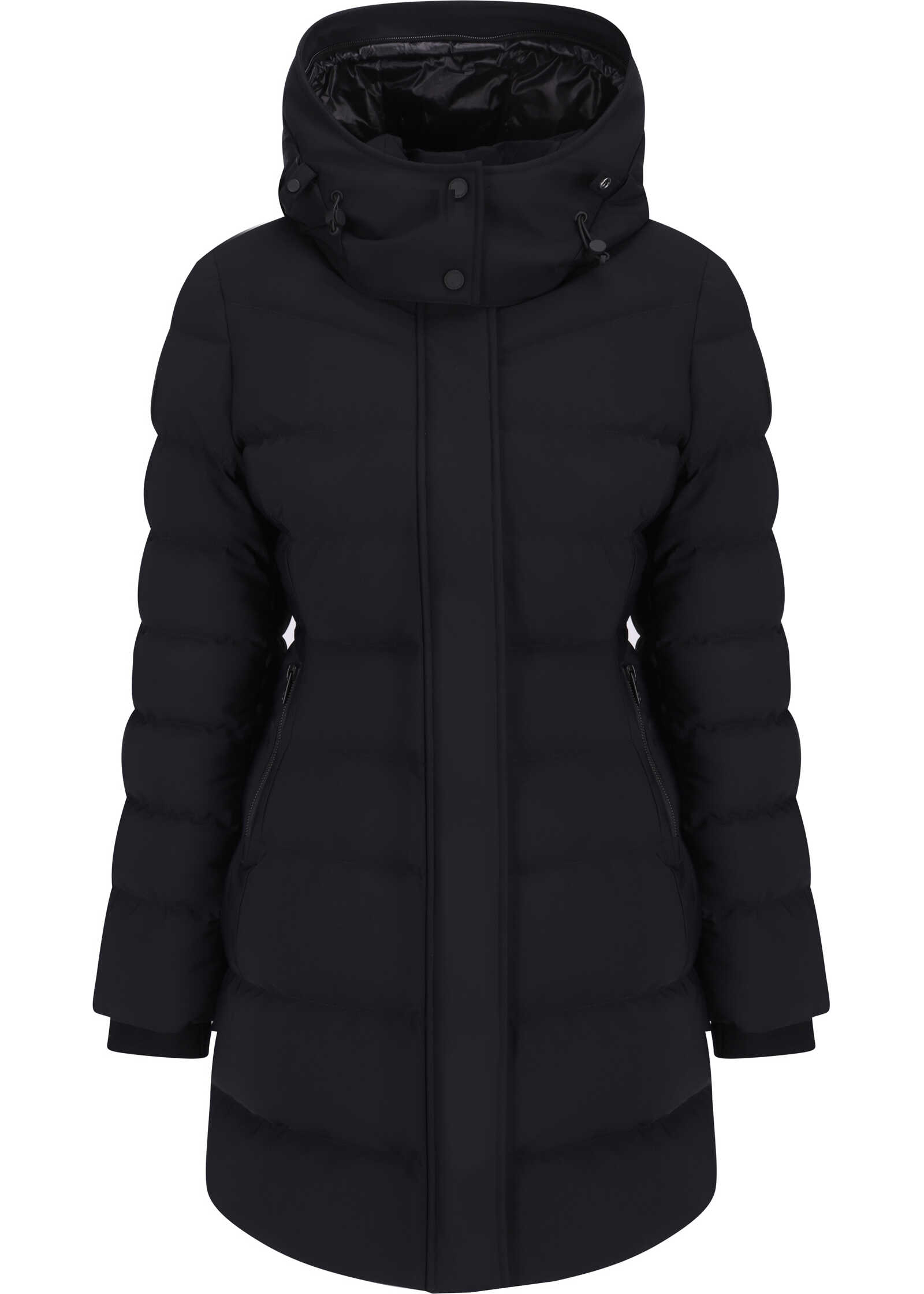 Watershed Down Jacket by Moose Knuckles, design with button-removable and drawstring-adjustable hood, front closure by double-slider zipper and magnetic buttons, two zippered welt side pockets, ribbed cuffs, two zippered adjustable side slits, all-over quilted and padded design, monochrome pattern, regular fit.