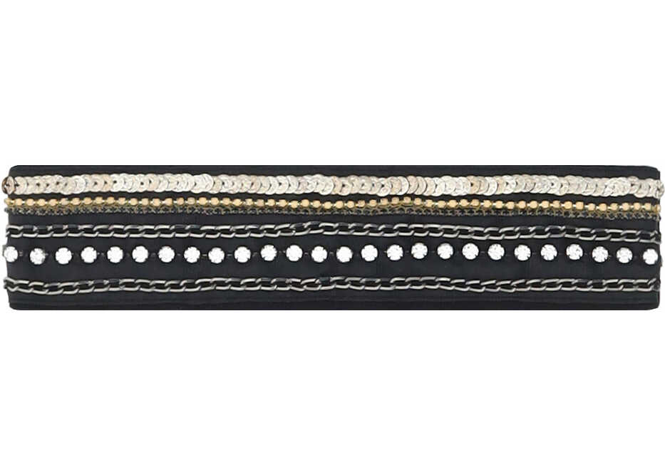 Belt by Sara Roka, patterned in monochrome fabric, design with sequin details, shiny jewels and all-over applied chains, adjustable design by knot.