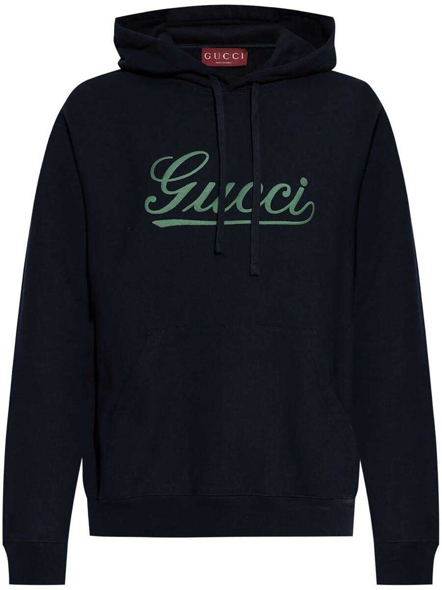 Gucci's cotton-jersey hoodie with contrasting embroidery and fine detailing is ideal for warm weather. The regular fit and fixed hood offer comfort and elegant style. - Hoodie Sweatshirt - Color: blue - Material: 100% plush CO - Gucci lettering embroidery in contrasting shades - Fixed hood with drawstring - Low shoulders - Pouch pocket - Ribbed trim - Trim: 98% CO, 2% EA - Embroidery: 100% PL - Made in Italy