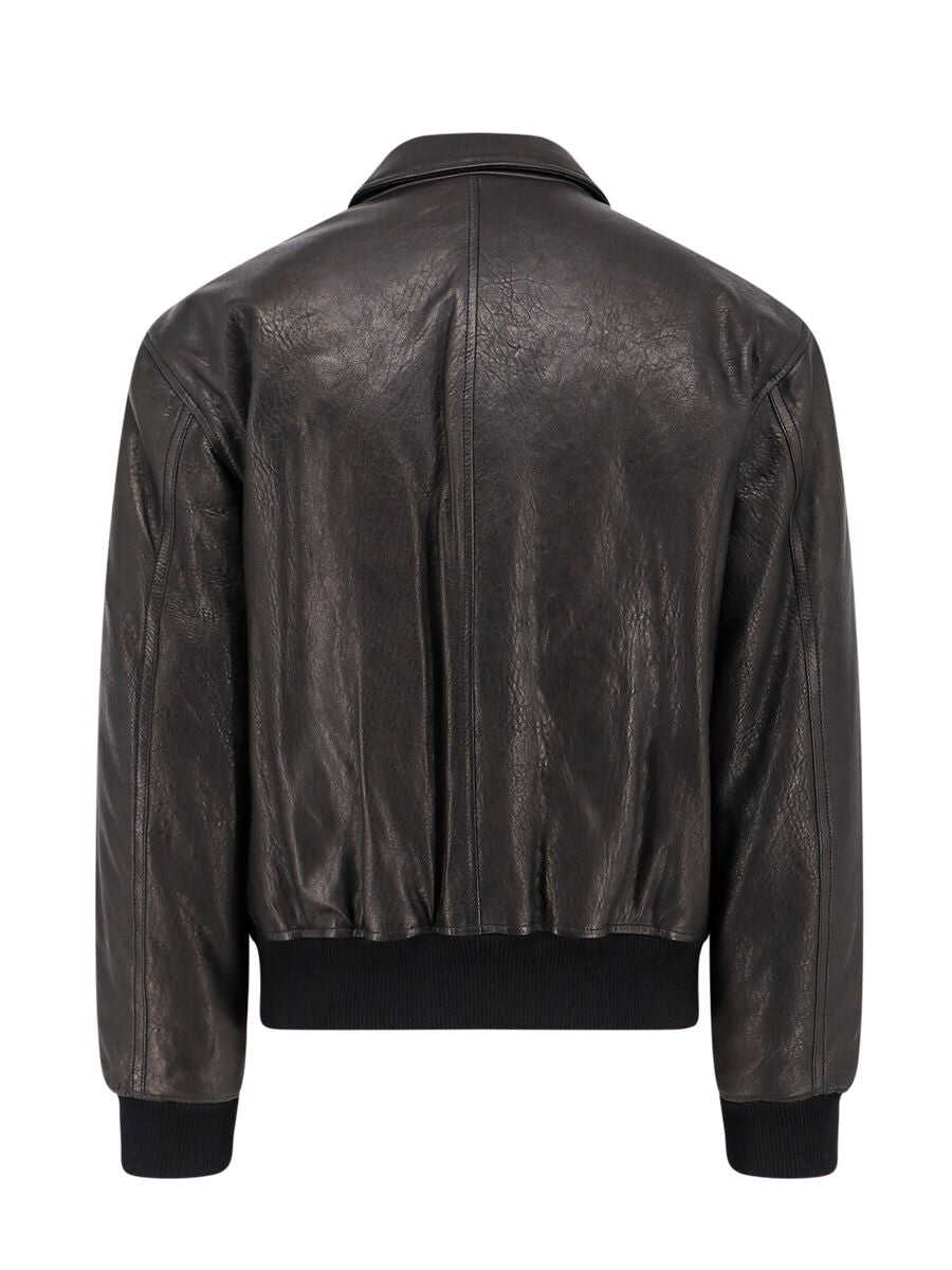 Saint Laurent's padded bomber jacket crafted in black grainy nappa. It features shirt-style collar, zip / snap-button closure, side pockets, long sleeves and wool ribbed knit edges.