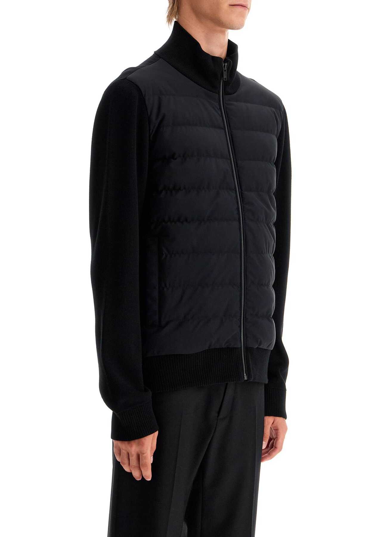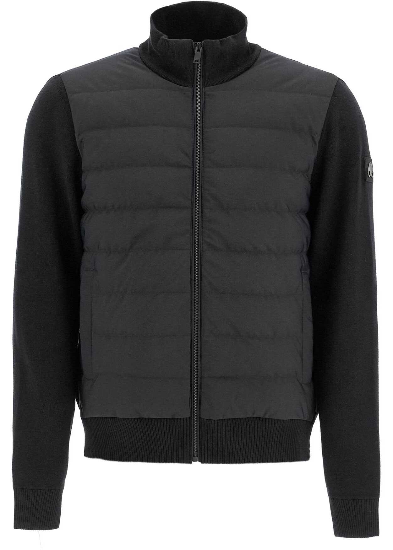 The Moose Knuckles hybrid cardigan is made of soft ribbed viscose knit with a quilted and padded stretch matte nylon front panel. It features a high collar and a slim fit, complete with a zip closure, side pockets with snap buttons, and two inner pockets. The model is 187 cm tall and wears size L.