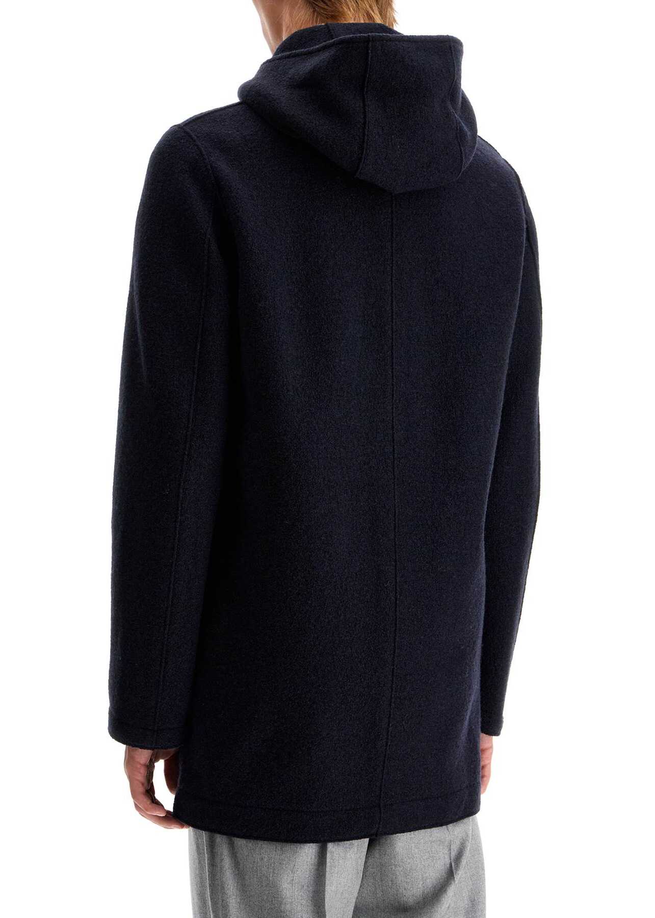 The Harris Wharf London coat with hood is made of soft boiled wool and has a straight cut. It features a parka-inspired design with a two-way zip closure and hidden snaps, side welt pockets, and an unlined interior with two small pockets. Regular fit. The model is 187 cm tall and wears size IT 48.