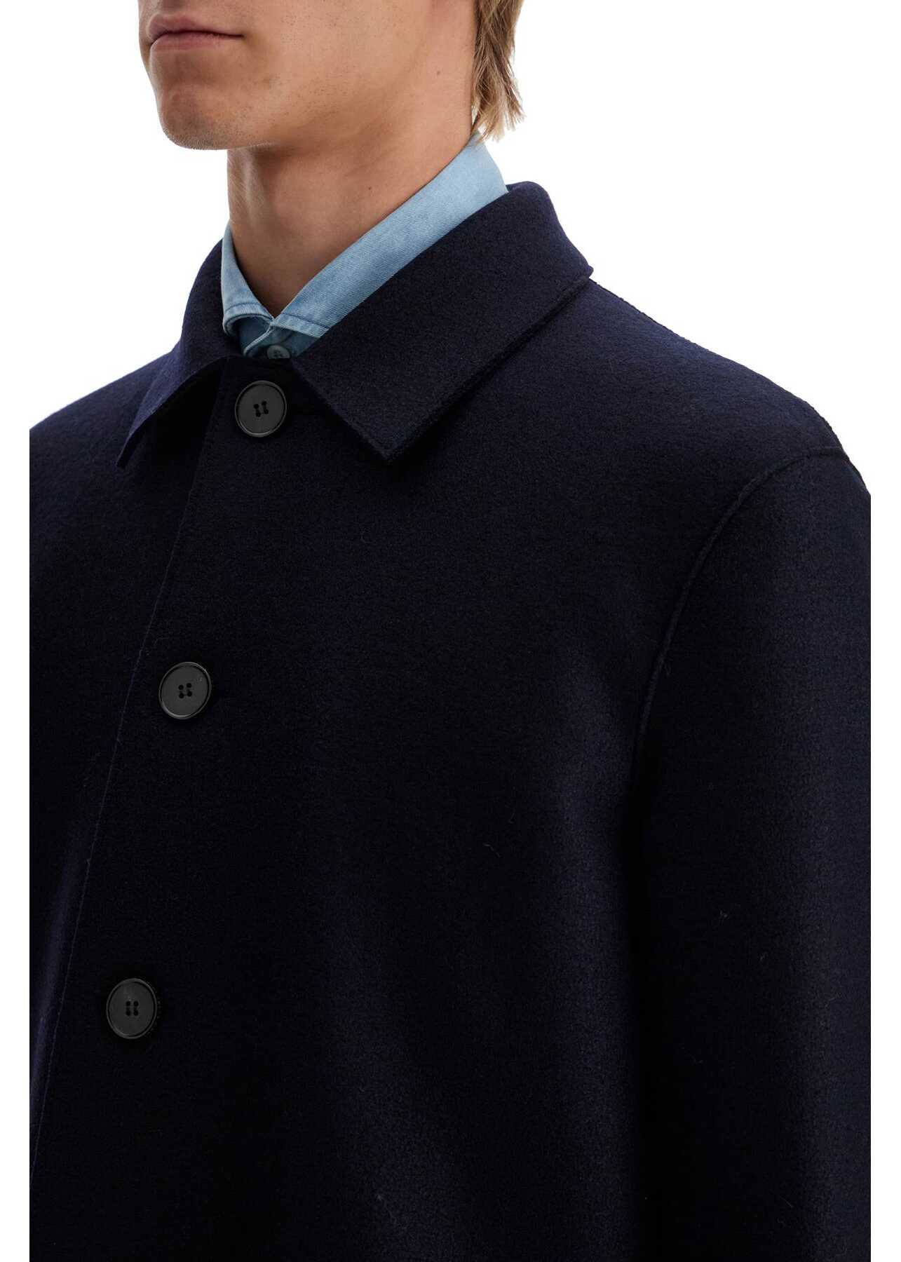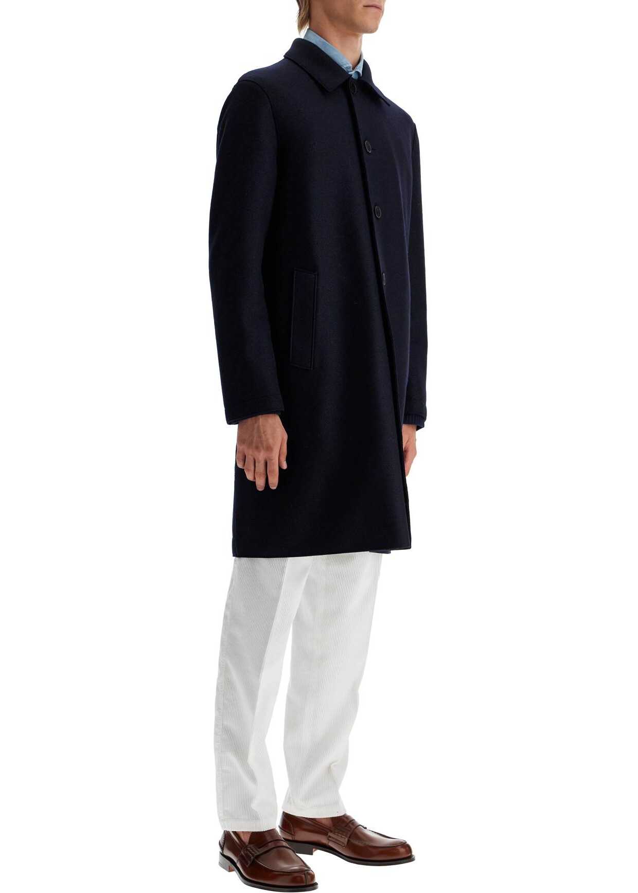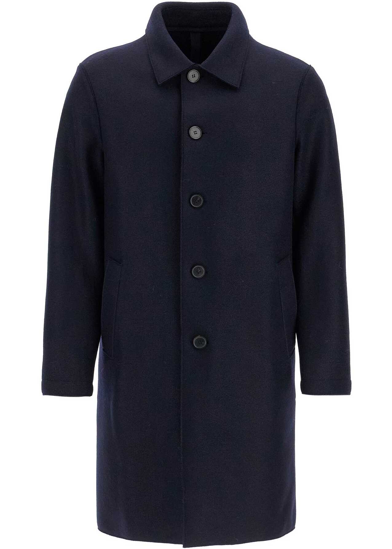 The Harris Wharf London knee-length coat is made of pure pressed virgin wool with a straight cut and slightly dropped shoulders. It features a car coat style design with a single-breasted button closure, shirt collar, side welt pockets, and a central back vent. The interior is unlined. The model is 182 cm tall and wears size IT 48.