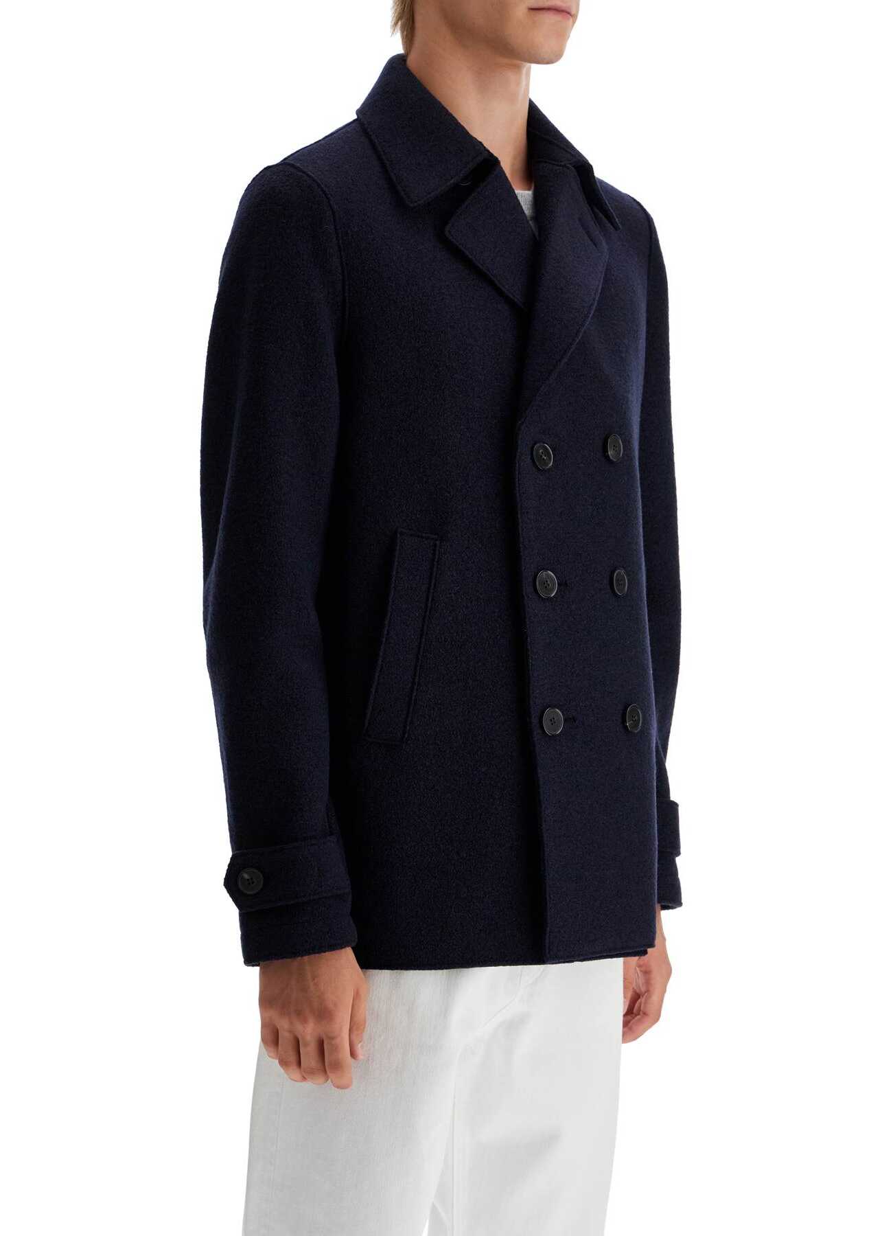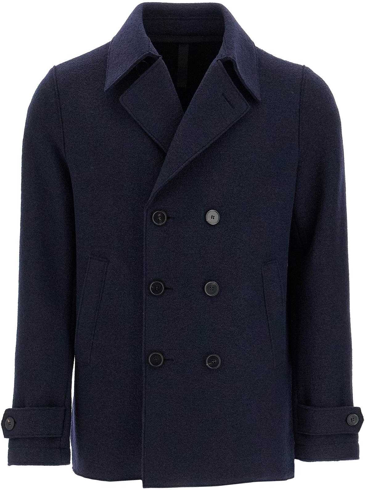 The Harris Wharf London double-breasted Caban is made of soft boiled wool with a six-button design. It features a wide convertible collar, side welt pockets, wrist tabs, and an unlined interior with two small pockets. Regular fit. The model is 187 cm tall and wears size IT 48.