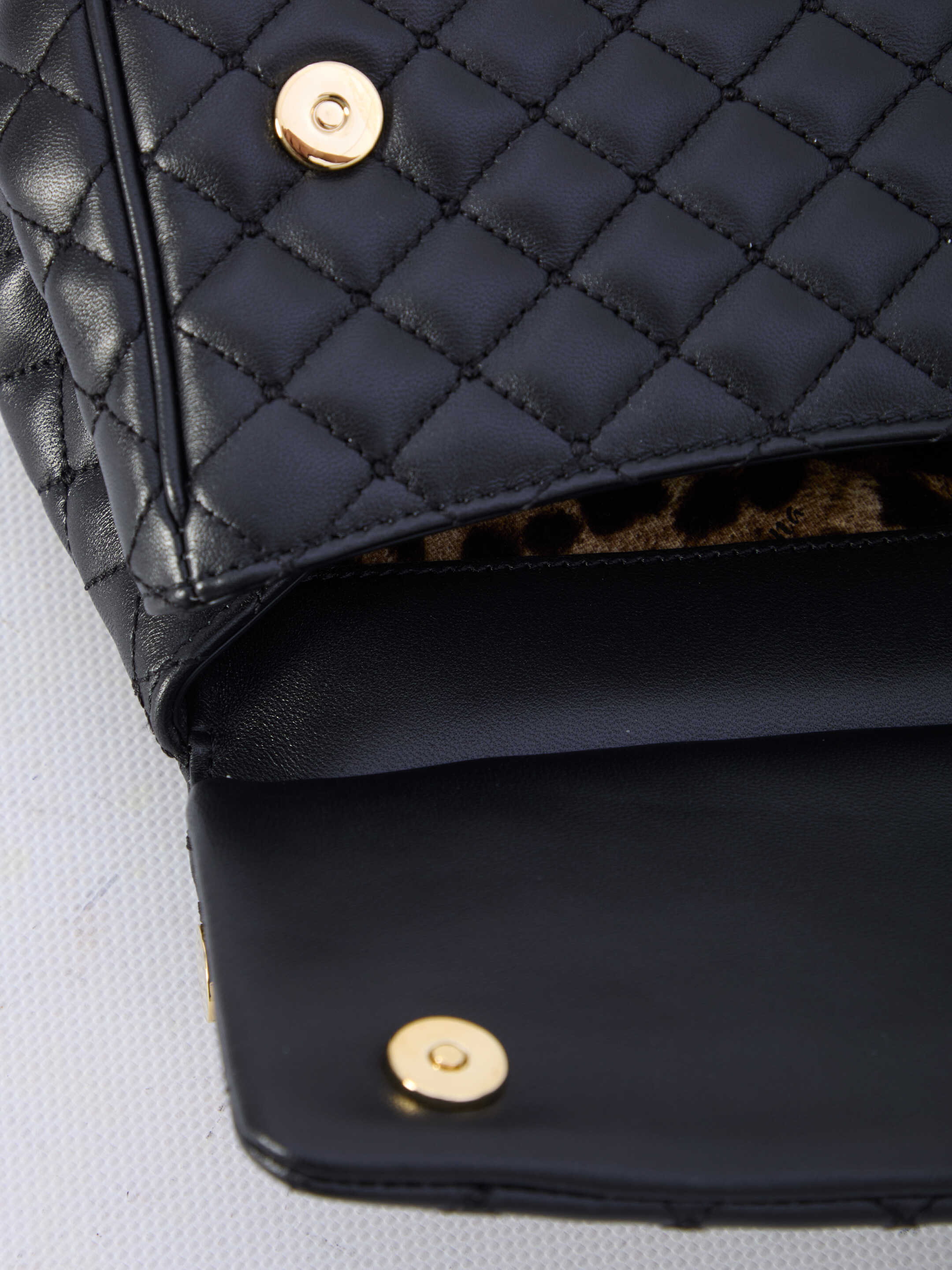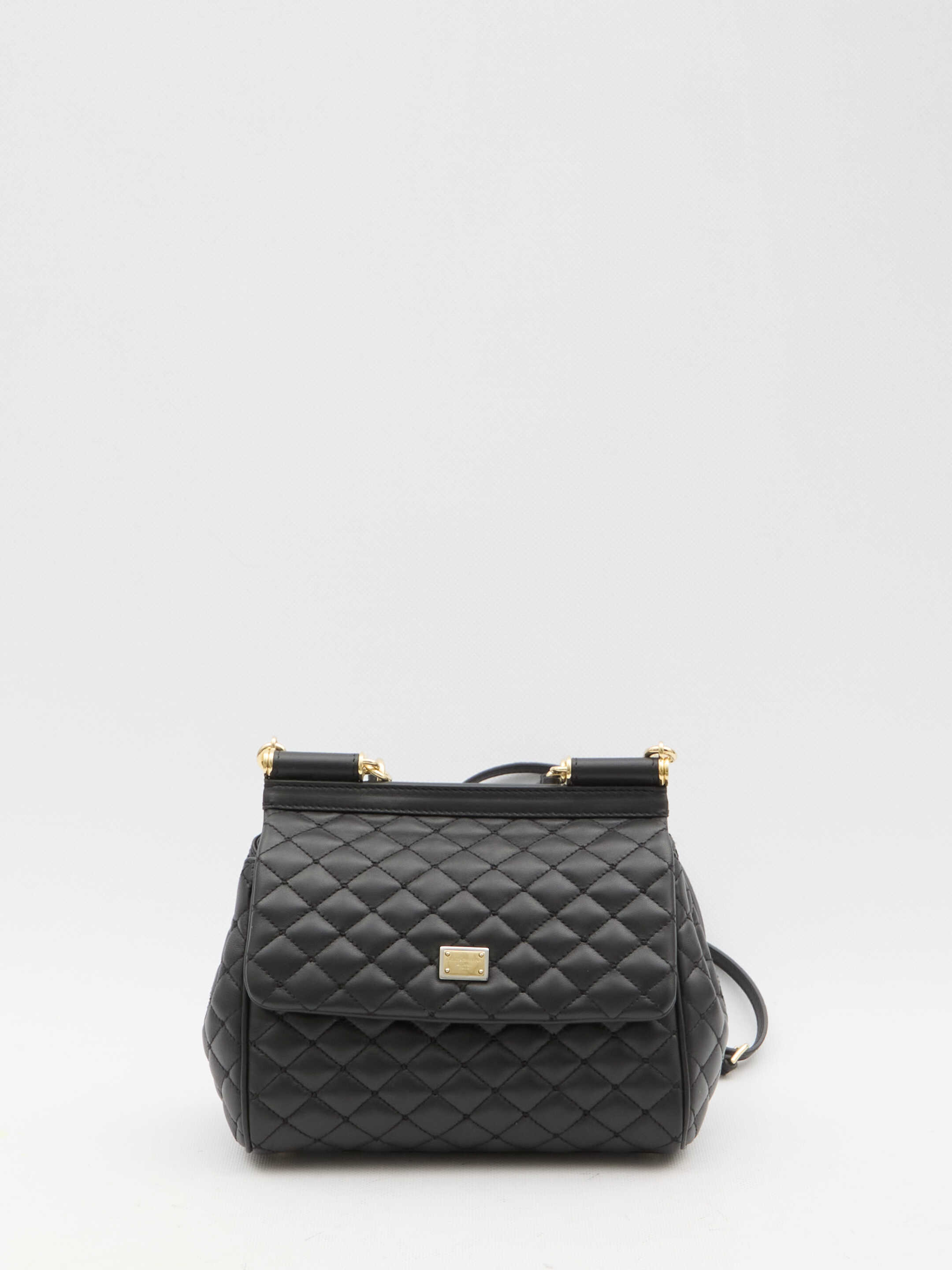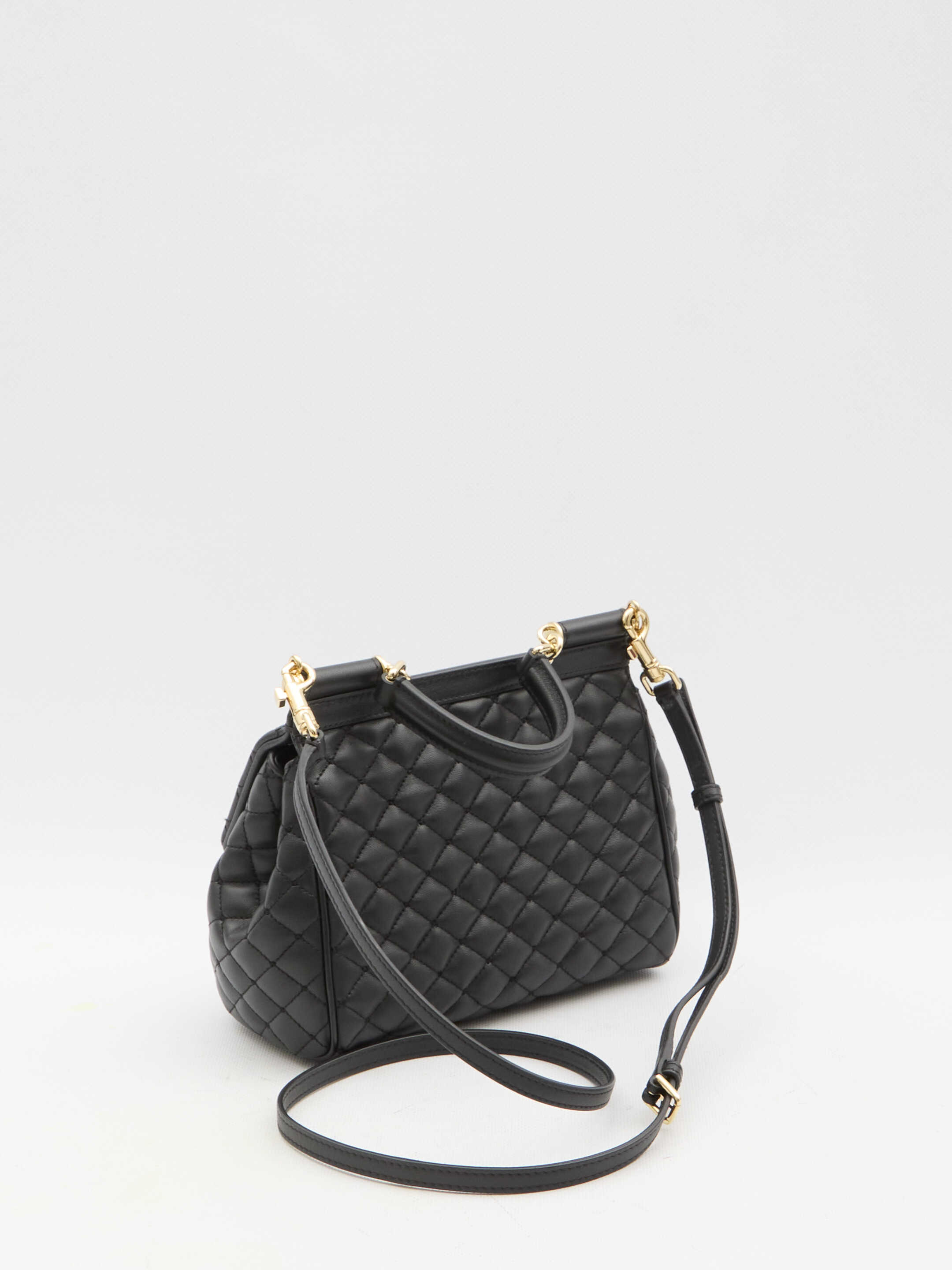 Sicily medium handbag in black quilted lambskin with branded tag in bicolor metal on the front. It features fixed top handle, adjustable and detachable shoulder strap, magnetic closure, one main interior compartment, one interior slip pocket and one interior card slot. Fabric lining with Leo print. Dust bag included. Any leather imperfections are not to be considered manufacturing defects, but a peculiarity of the material.