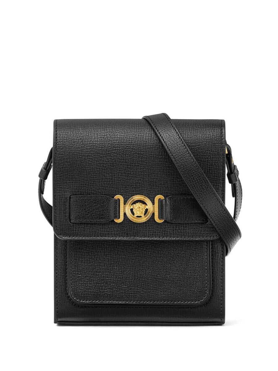 black goatskin grained texture Medusa gold-tone logo plaque adjustable shoulder strap foldover top main compartment full lining internal card slots