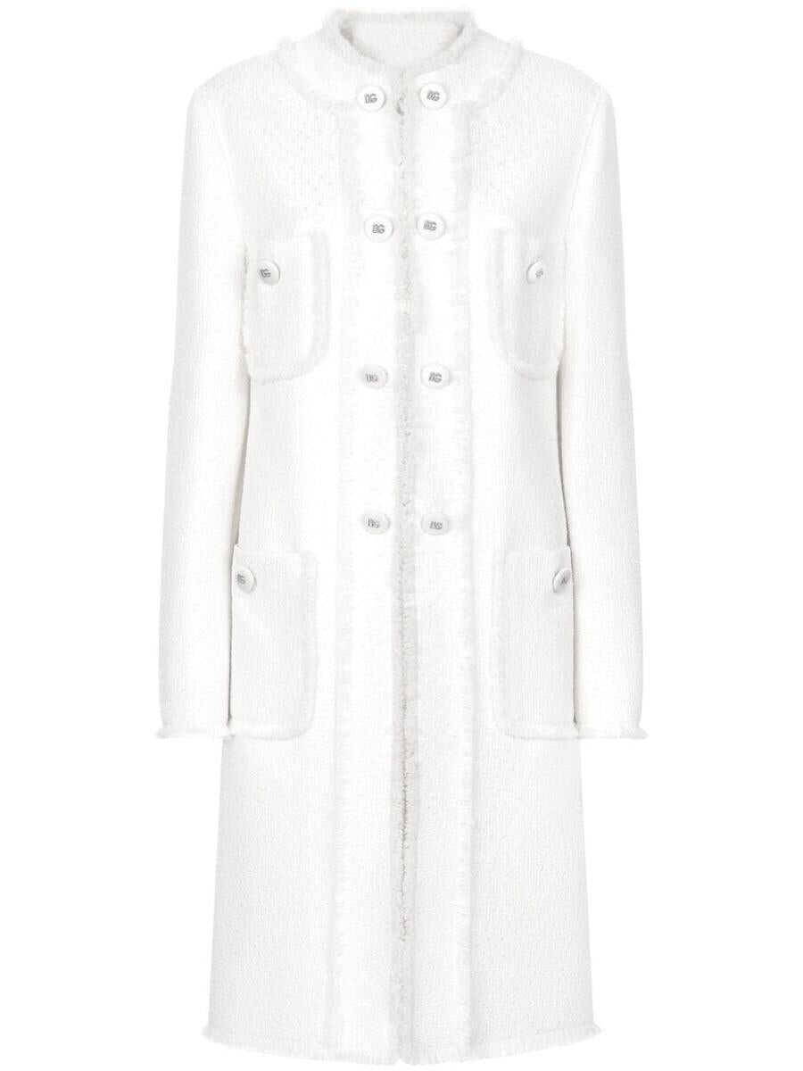 white tweed frayed edge crew neck concealed front fastening long sleeves four front patch pockets knee-length straight hem