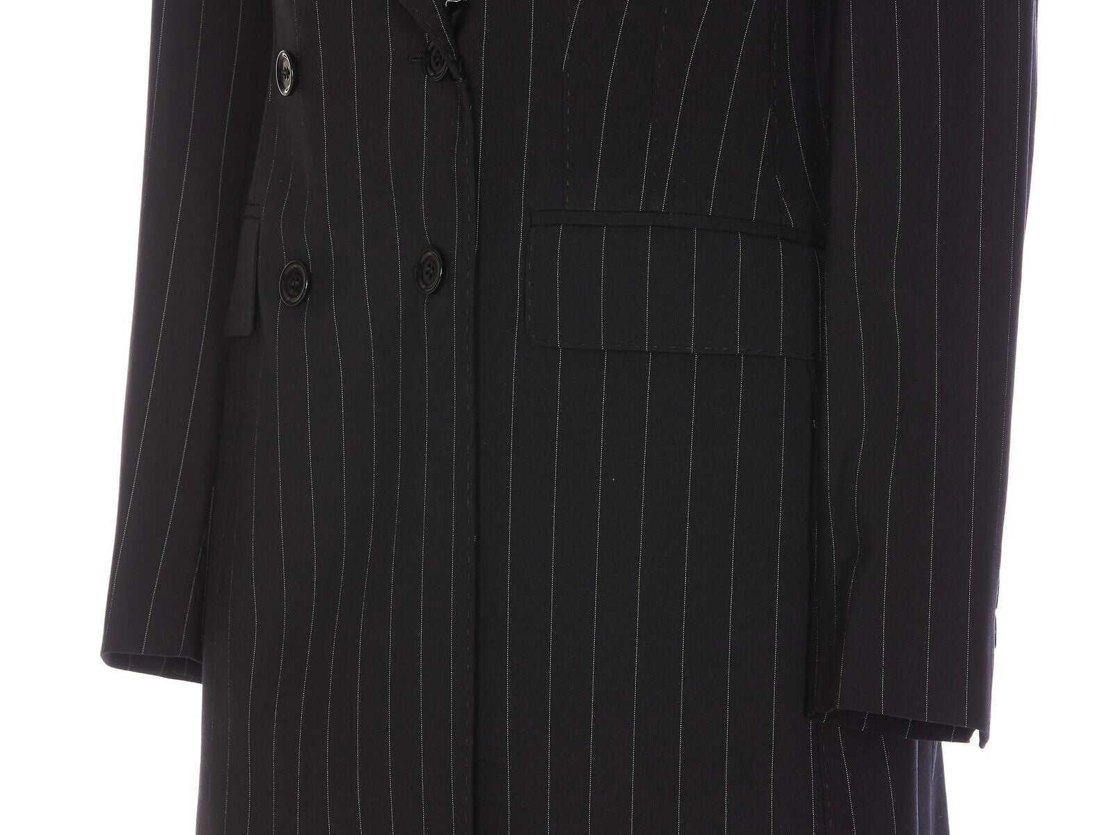black virgin wool blend pinstripe pattern double-breasted button fastening peak lapels long sleeves buttoned cuffs chest welt pocket dart detailing two side flap pockets central rear vent full lining shoulder pads straight hem