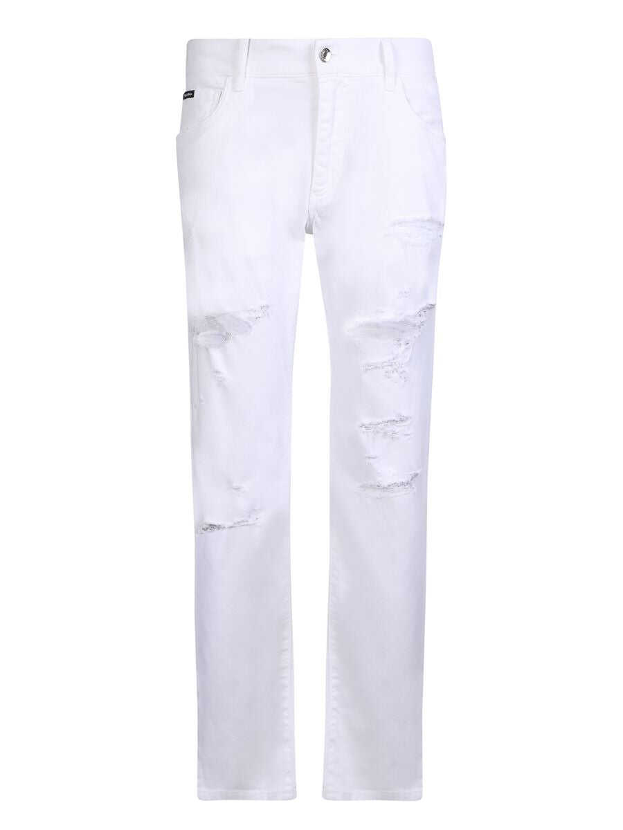 distressed-effect cotton straight trousers from DOLCE & GABBANA featuring white, stretch-cotton, distressed effect, logo plaque, low-rise, straight leg and classic five pockets.