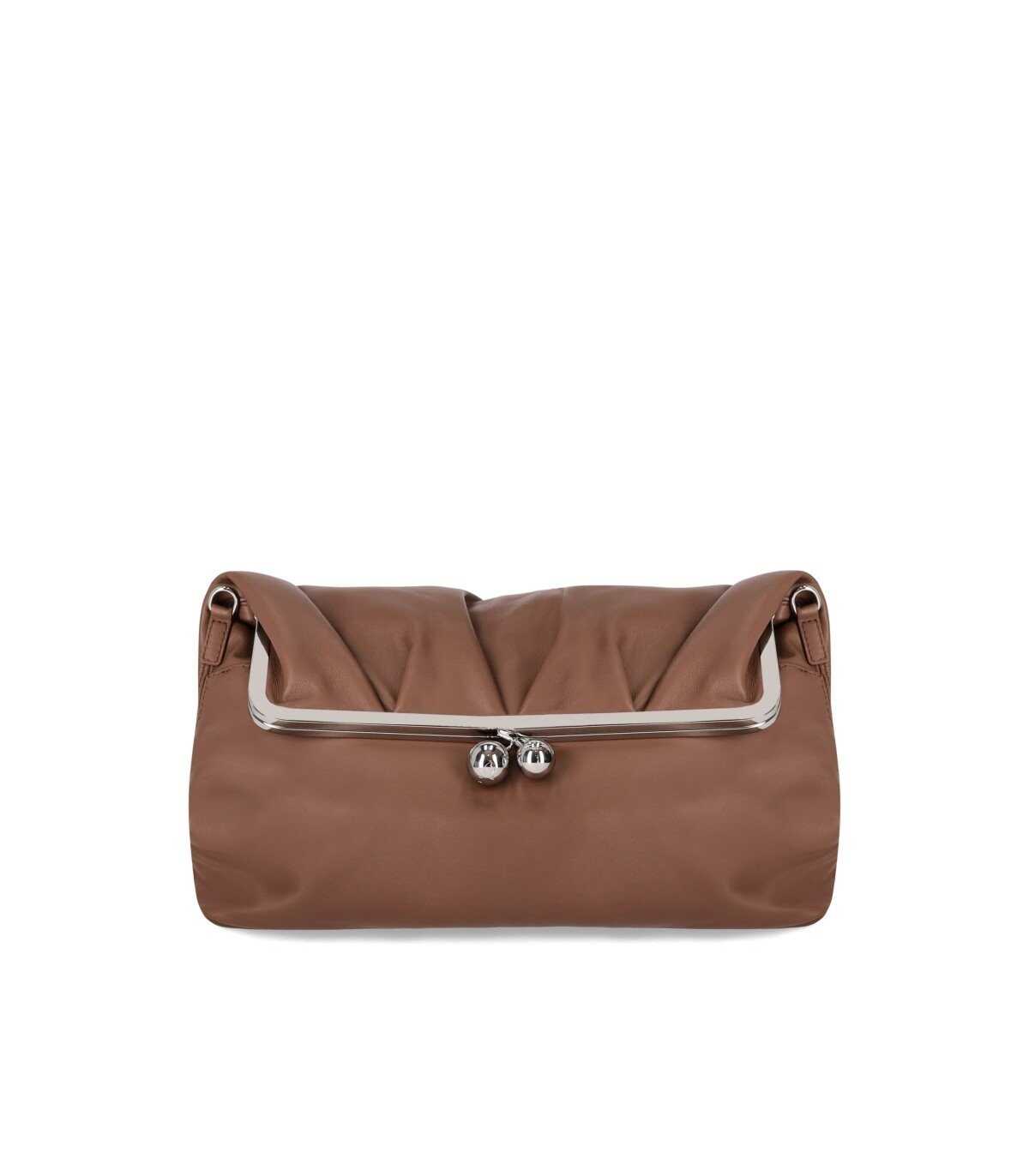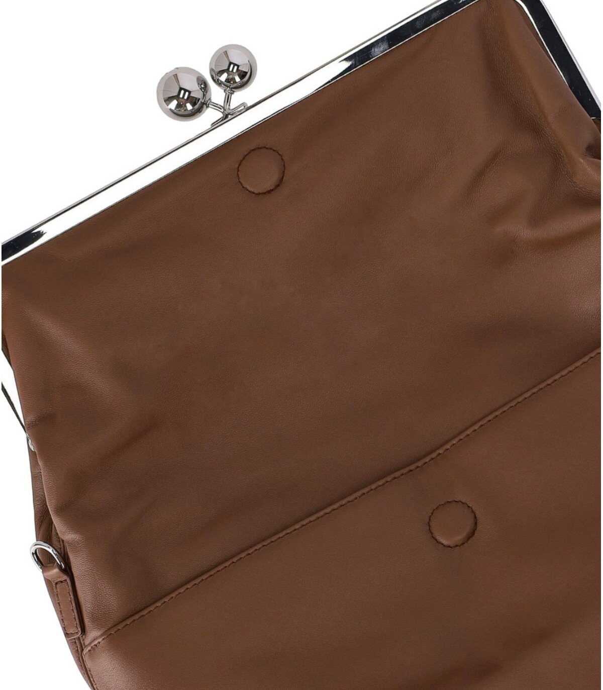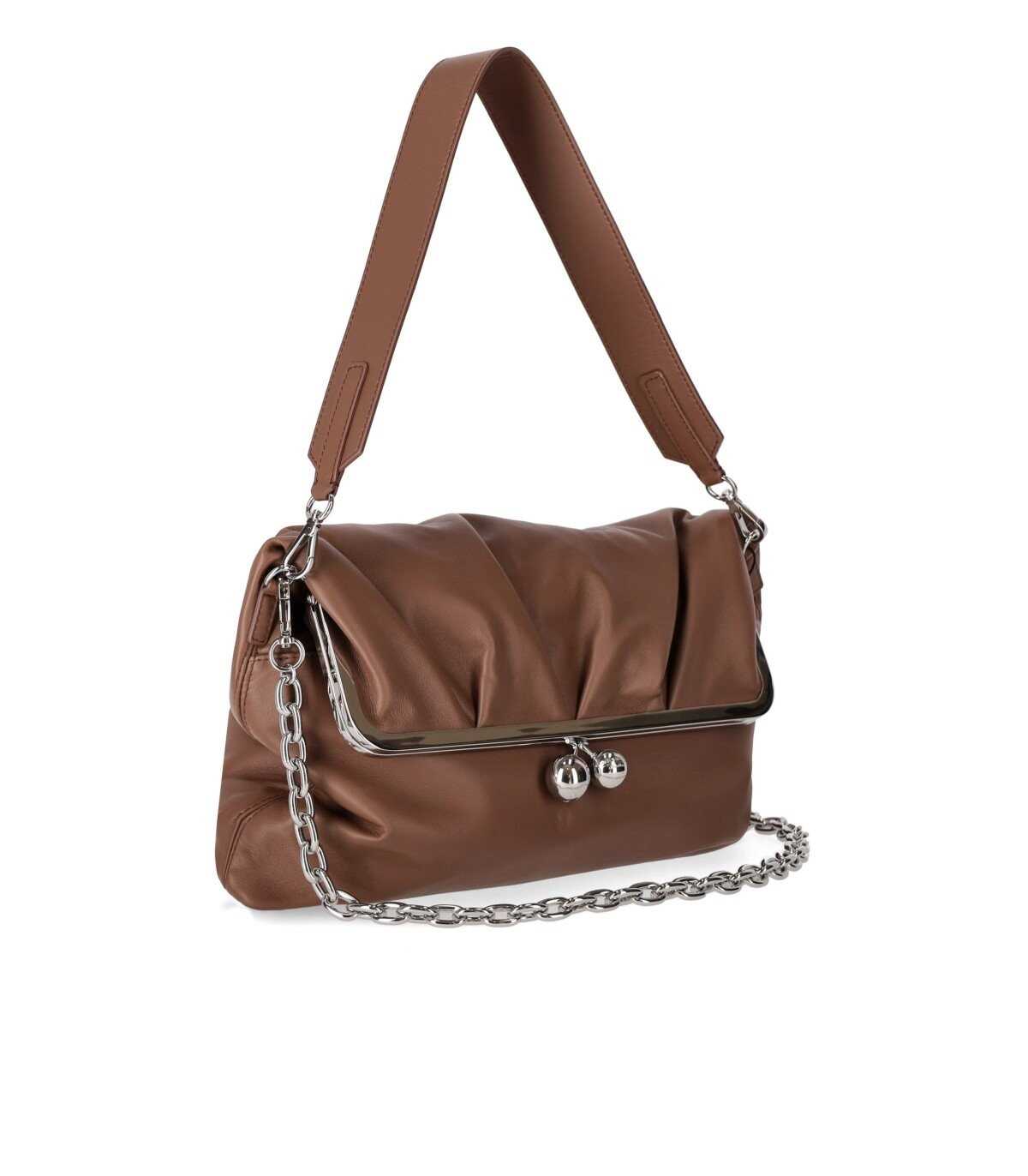 Max Mara Weekend Slalom Bag made of brown nappa leather. Lined interior, equipped with a flat pocket, silver metal details, and closure with logoed ball. Magnetic flap, tone-on-tone leather shoulder strap, and chain crossbody strap. Dimensions 37x24x5 cm.