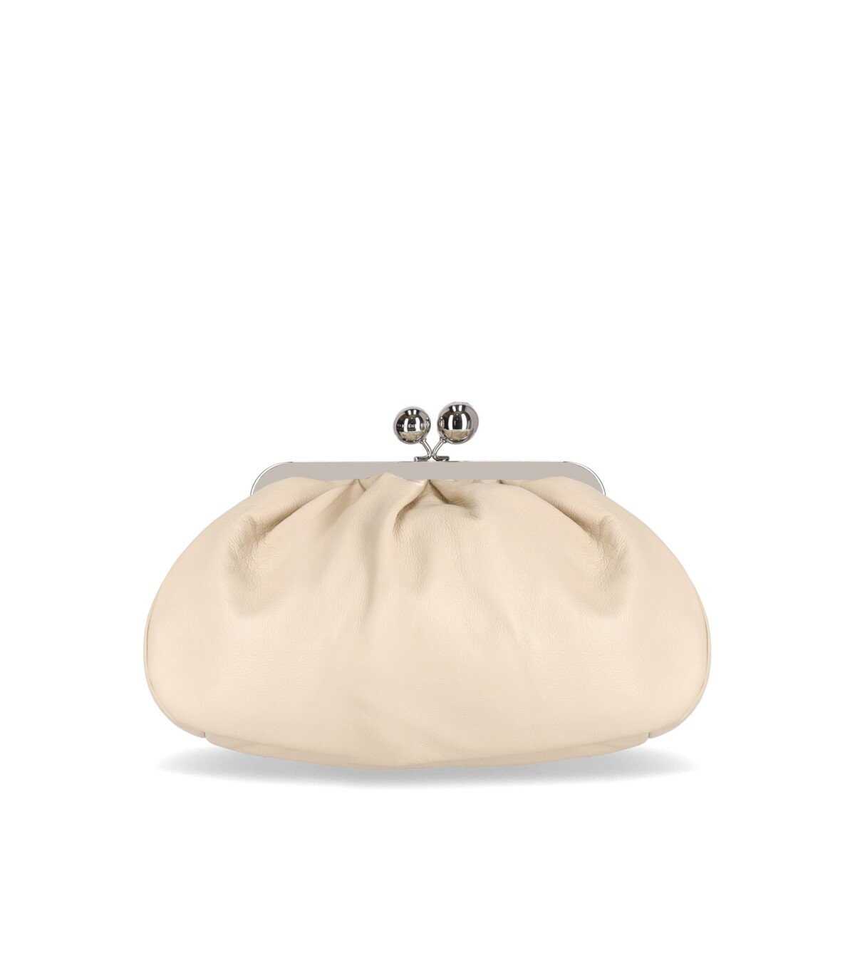 Max Mara Weekend Cubico Pasticcino Clutch made of ivory nappa, characterized by the iconic closure with branded spheres. Silver metal details, patterned inner lining, tone-on-tone shoulder strap, and detachable chain strap. Dimensions 31x13x21 cm.