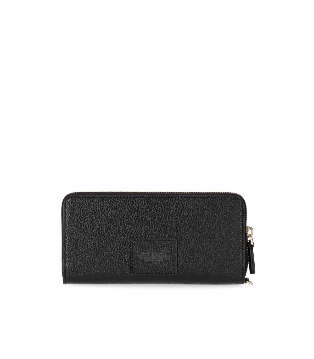 Marc Jacobs Leather Continental Wallet made of black pebbled leather. Front logo, zip closure, and interior equipped with numerous compartments for cards, banknotes, and coins. Removable wrist strap. Dimensions 20x11x2 cm.