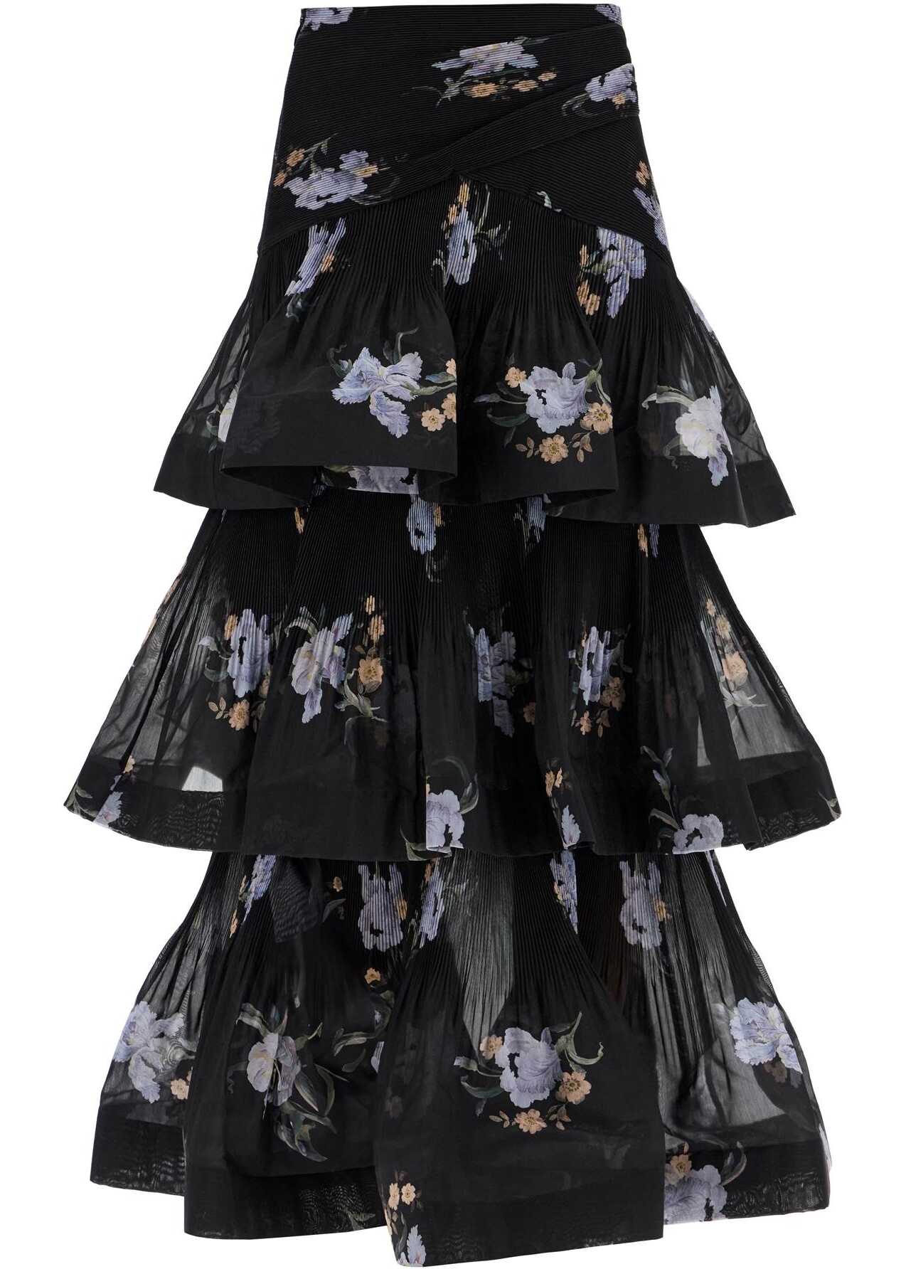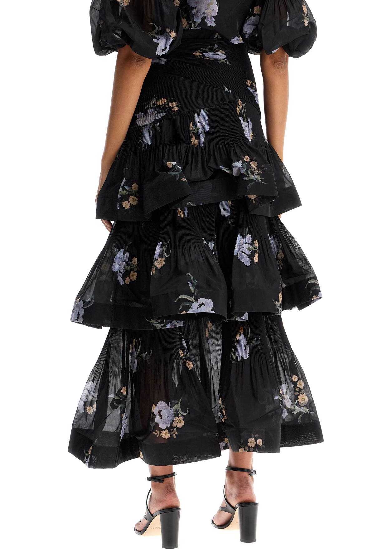 This midi skirt by Zimmermann is made of technical organza with a pleated ruffle design, adorned with a floral print. It features a high waist, invisible side zip closure, and partial lining. The model is 177 cm tall and wears size 0 Zimmermann.