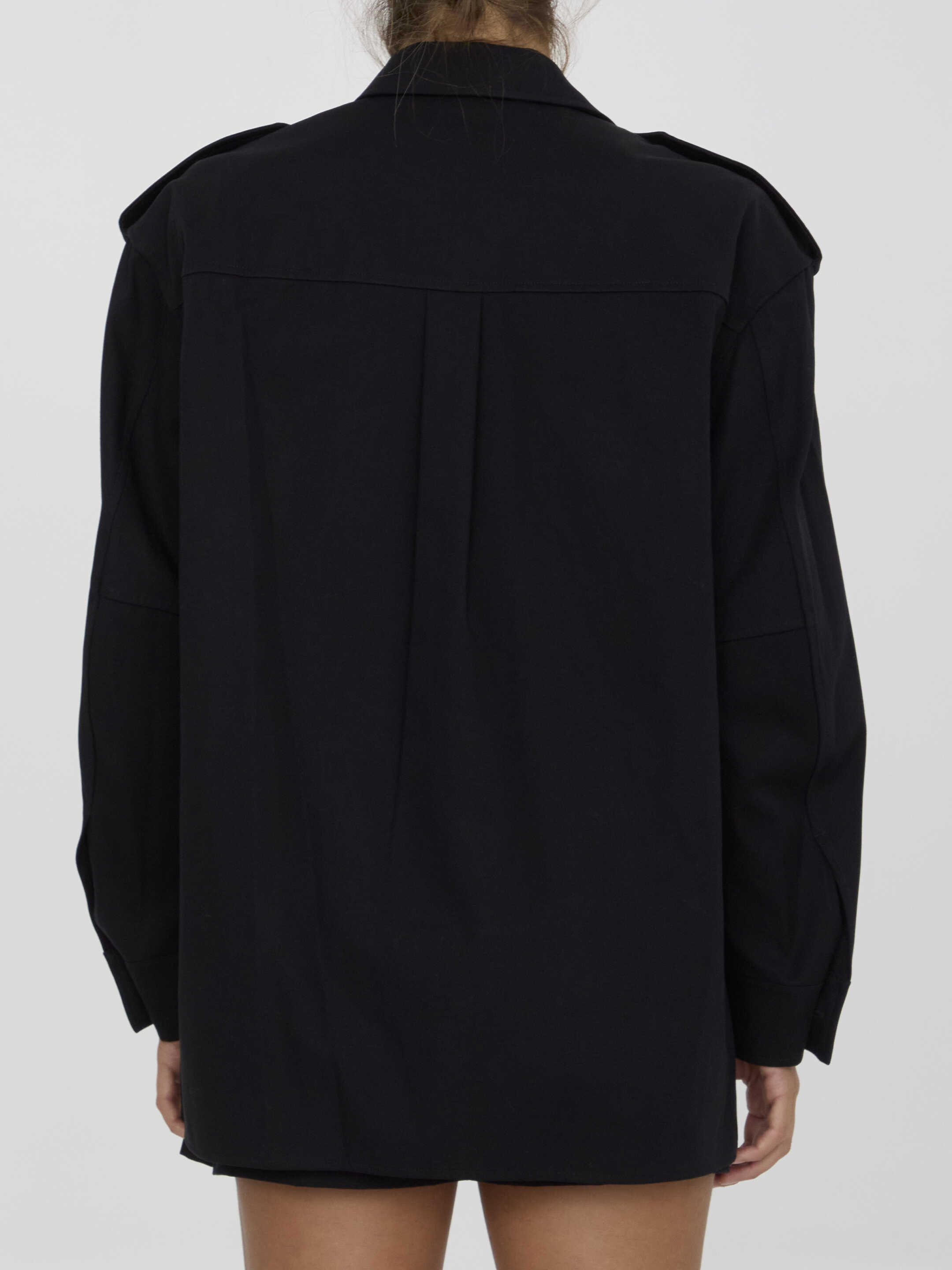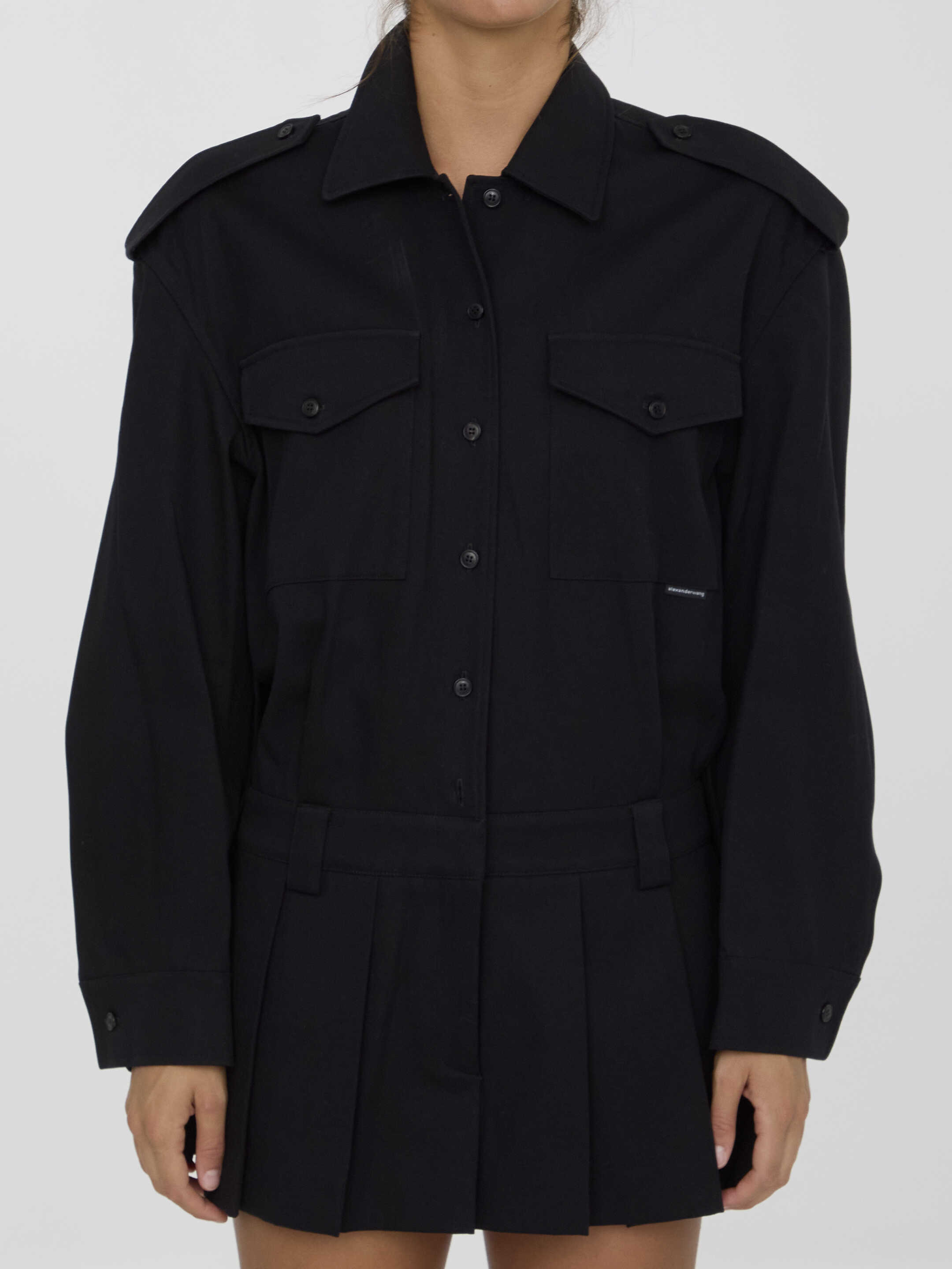 Pre-styled romper in black cotton twill with shirt-style upper part and skort-style lower part. It features front button closure, two buttoned flap pockets on chest, two side welt pockets and pleated design on hem. Regular fit.