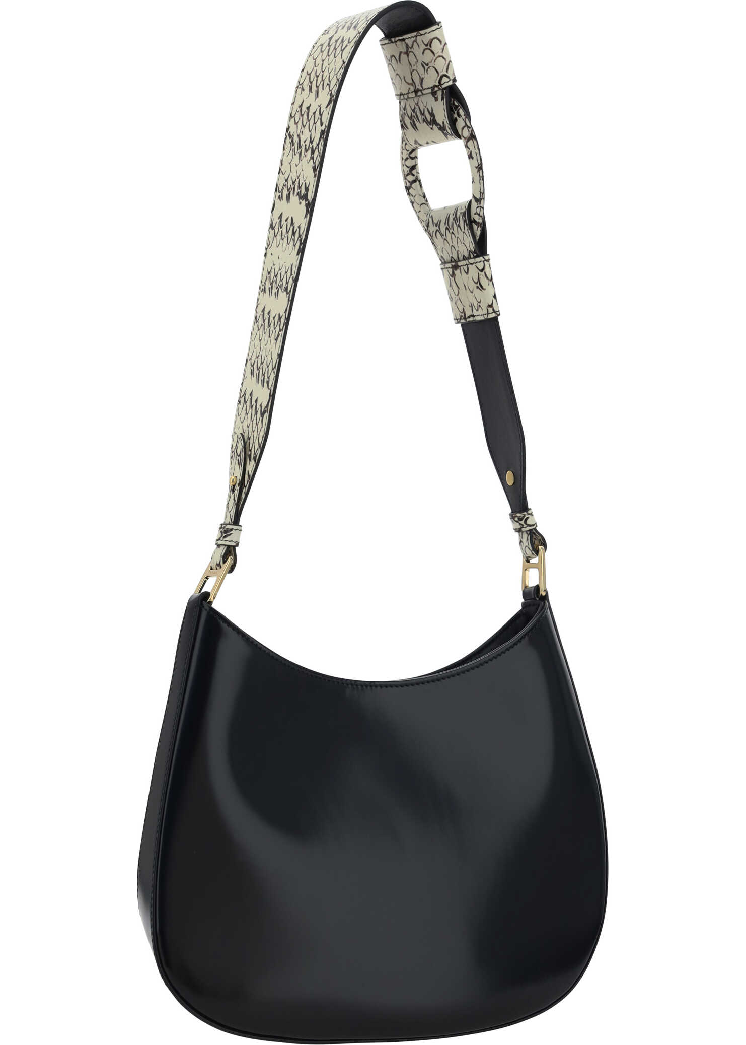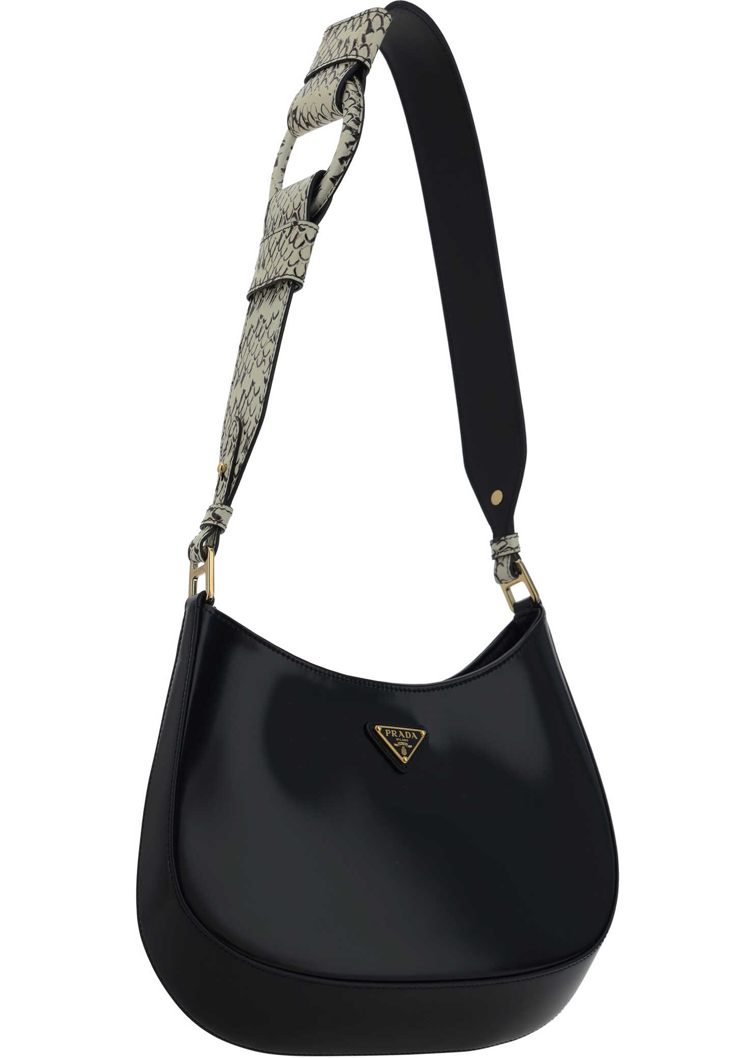 Leather Shoulder Bag by Prada, python-patterned adjustable flat shoulder strap, magnetic button closure at top, iconic enameled triangular signature brand plaque applied to front, single interior compartment, compact patent leather design.