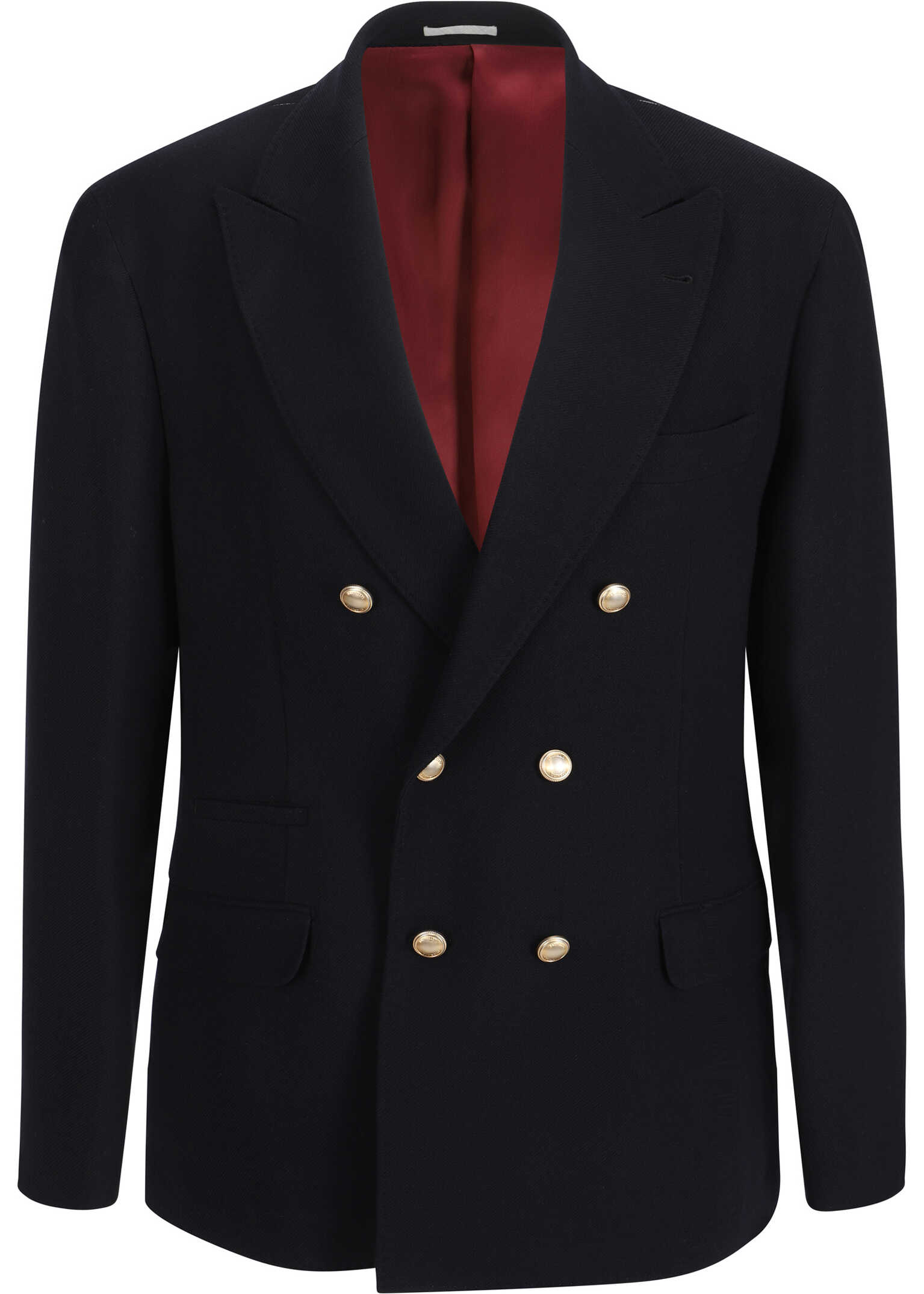 Wool Blazer Jacket by Brunello Cucinelli featuring a double-breasted front closure with contrasting buttons, spear lapels, two welt pockets with side flaps, a front welt pocket, two slits at the back, a monochrome pattern, and a regular fit.